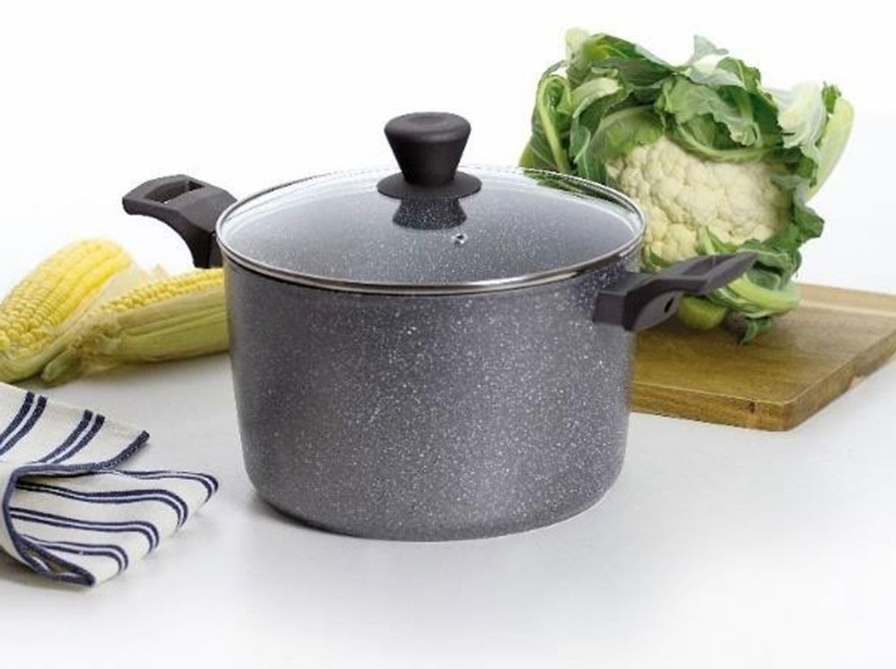 Oala cu capac, din aluminiu, cu invelis Qualum Basic Stone Edition. Vasele Silverstone au un aspect unic, care imita piatra, oferind o combinatie a rusticului cu modernul, pastrand insa eleganta prin nuanta neutra, potrivita in orice bucatarie. Aluminiul permite transmiterea caldurii in mod eficient, ceea ce face gatitul mult mai rapid, si deci mai economic. Invelisul in interiorul oalei o face foarte rezistenta la zgarieturi, iar manerele soft-touch si confortabile, asigurand o prindere usoara. Acestea pot fi folosite pe orice tip de aragaz, inclusiv cele cu inductie.