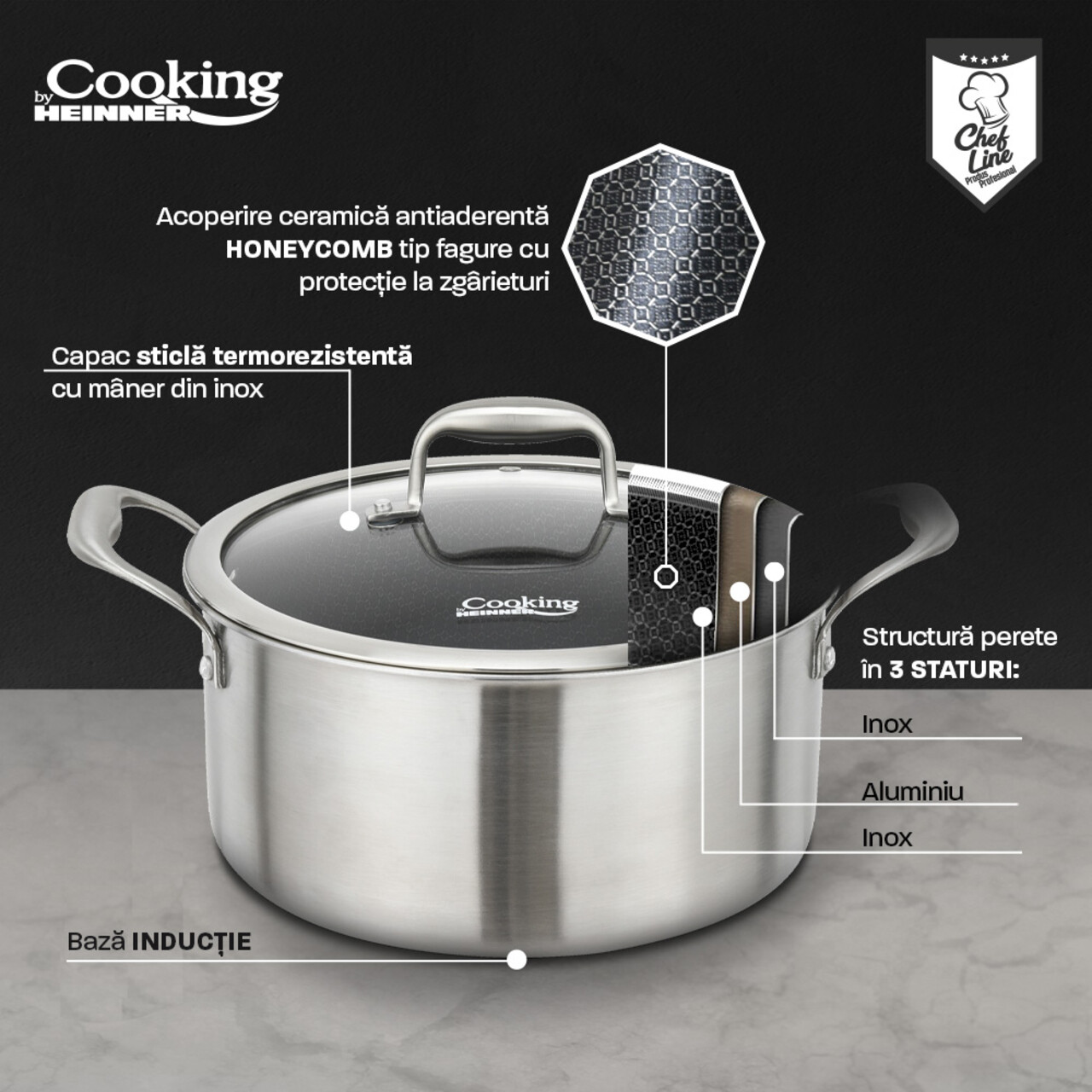 Vasele din inox Heinner au baza capsulata, astfel incat caldura sa fie distribuita uniform pe toata suprafata bazei, reducand considerabil consumul de energie si timpul de preparare. Capacul este prevazut cu o portiune perforata pentru a elimina aburii in timpul fierberii. Adaugand caracteristici precum acoperirea ceramica antiaderenta HONEYCOMB, cu protectie la zgarieturi, peretele in trei straturi (inox-aluminiu-inox) si baza cu inductie, face ca acest produs sa fie ideal pentru bucataria dumneavoastra.