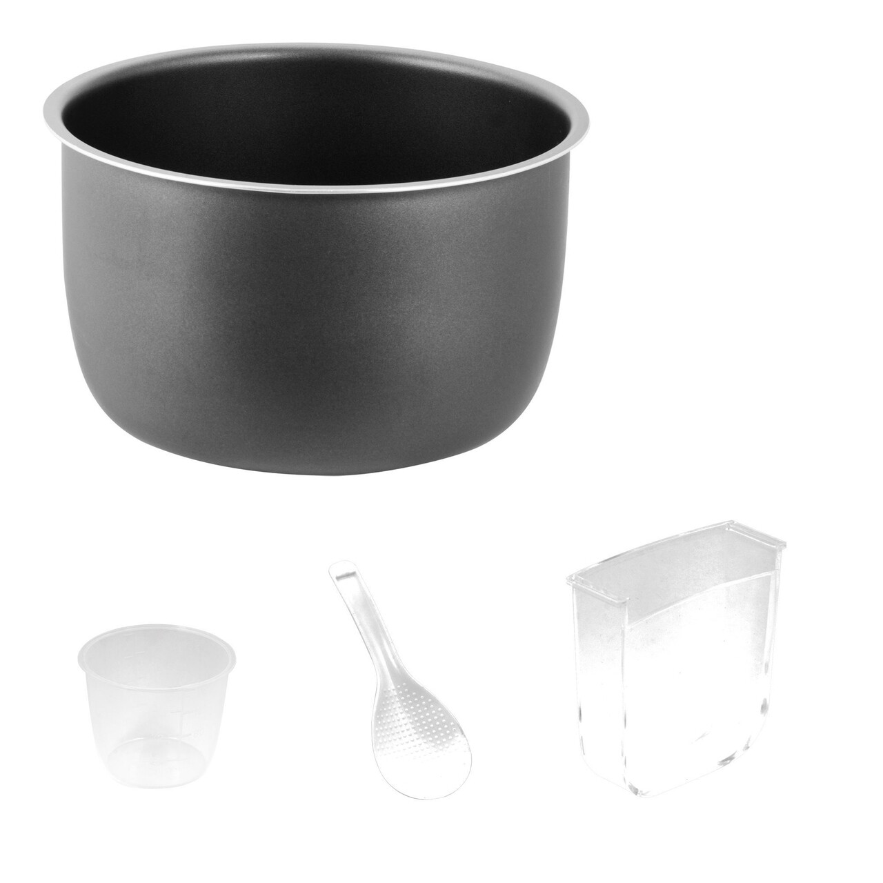 Oala electrica multifunctionala 2 in 1 are 6 accesorii incluse: lingura pentru orez, lingura de masurare, colector apa, cos pentru abur, gratar si suport capac pentru air fryer.
