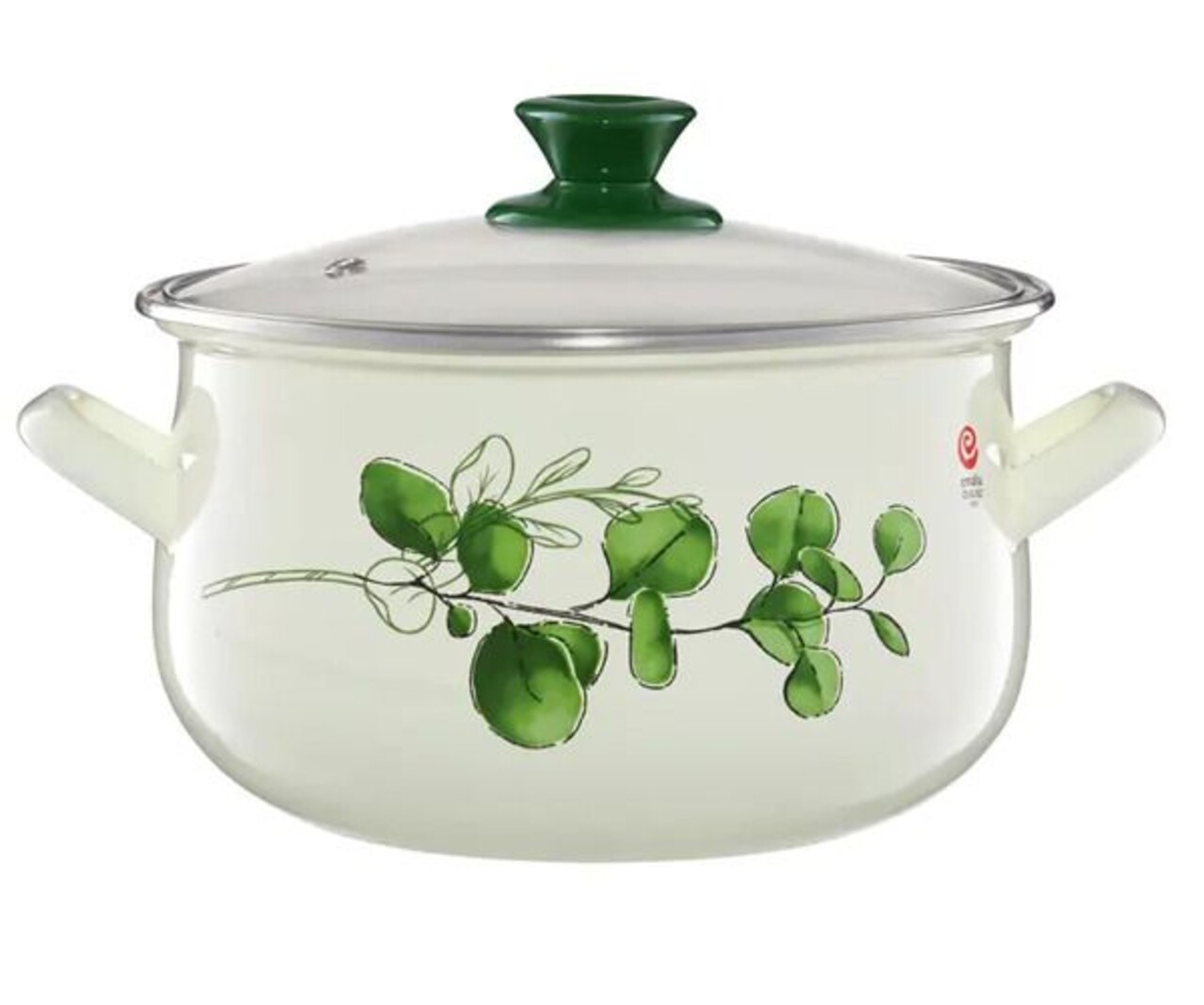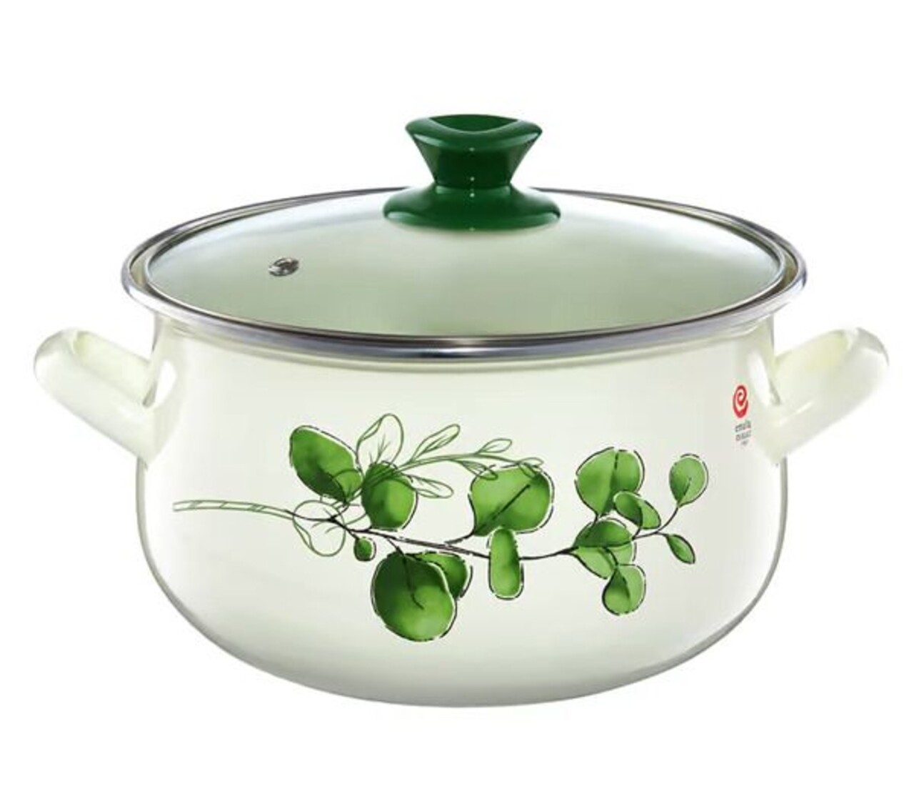 Forma vasului este convexa numita PYZA. Modelul de crenguta de eucalipt este modern si elegant. Oalele emailate se disting prin functionalitatea lor, pot fi spalate in masina de spalat vase.