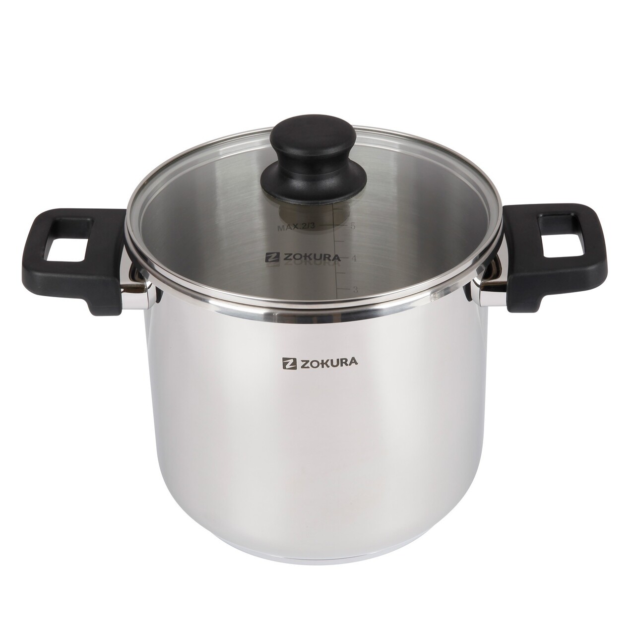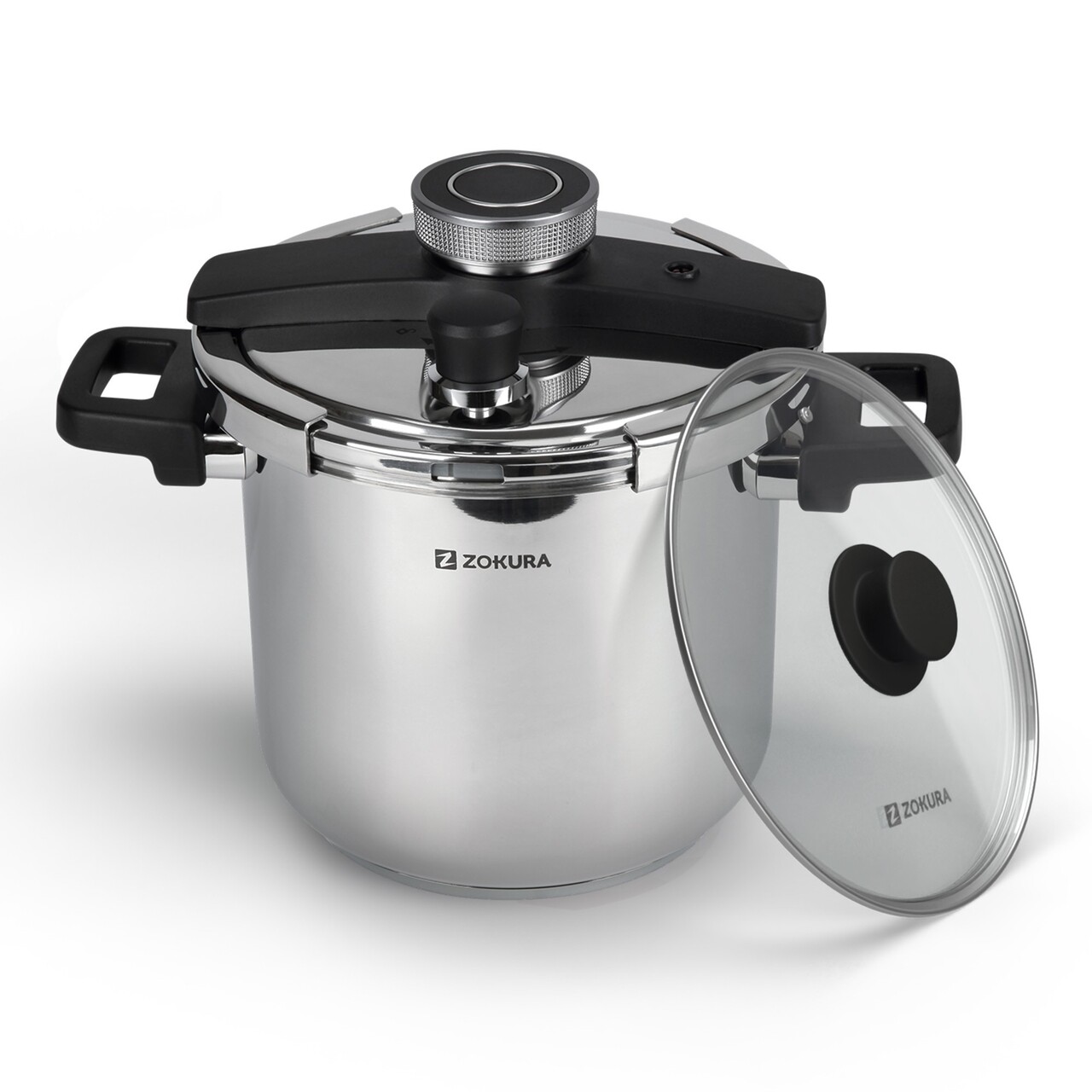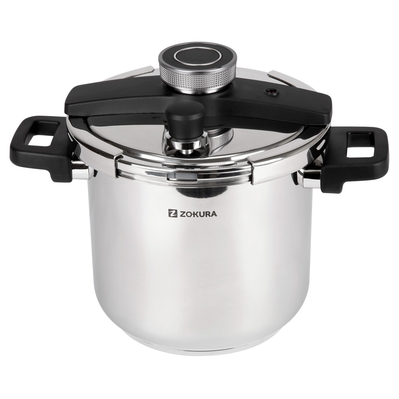 Sistemul de inchidere a capacului, Manerele din plastic cu un design placut, Precum si gradatiile existente pe peretii vasului(1/2 si 2/3 din capacitatea totala, Dar si gradatiile pentru litri)Usureaza utilizarea.Oala sub presiune de la Zokura poate fi folosita pe toate tipurile de plita, Inclusiv pe cele cu inductie si poate fi curatata in masina de spalat vase.