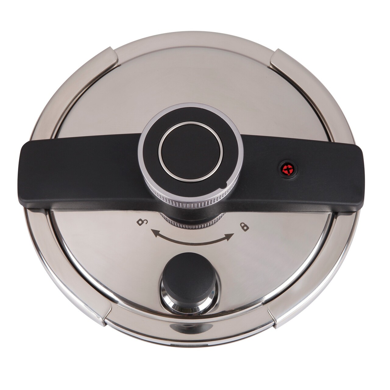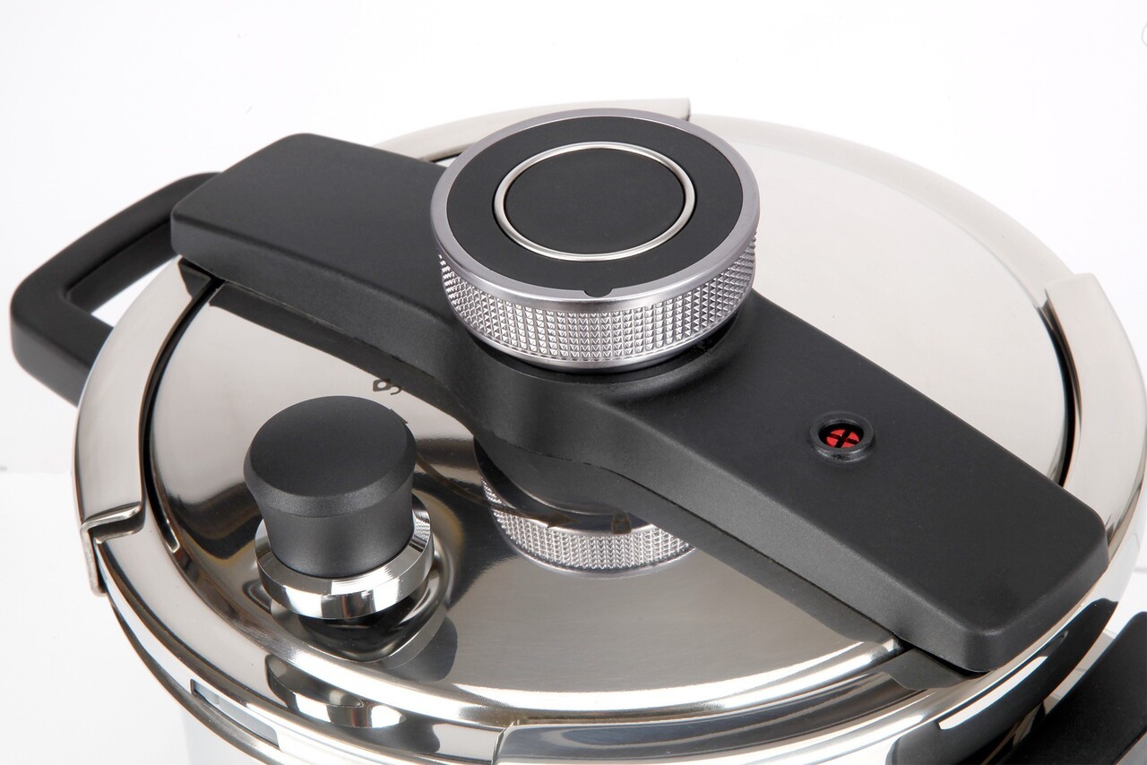 Sistemul de inchidere a capacului previne deschiderea sub presiune.Siguranta este asigurata prinMultiplele sisteme integrate:Supapa de blocare de siguranta; supapa de reglare a presiunii; fereastra de siguranta pentru garnitura; manere rezistente la caldura. In plus, Gradatiile de pe peretii vasului, Pentru nivel minim si maxim admis, Ghideaza utilizatorul. O metoda moderna de gatit, Rapid, Fara risc, Fara stres.