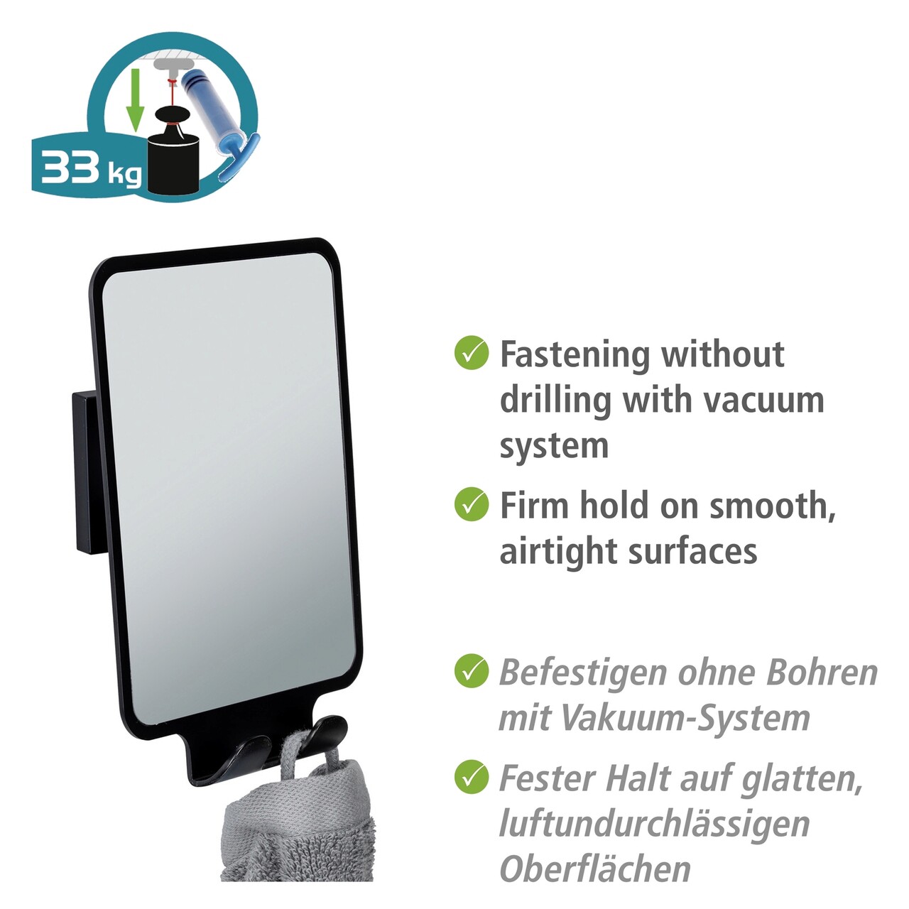 Seria de accesorii pentru baie Quadro de la WENKO impresioneaza prin designul sau patrat in culoarea moderna negru, combinatia de materiale de inalta calitate si atasarea deosebit de usoara! Toate accesoriile pentru baie din seria de baie Quadro sunt echipate cu sistemul de prindere Vacuum-Loc®! Acest lucru face ca accesoriile sa fie atasate rapid si usor si asigura o prindere sigura pe toate suprafetele impermeabile la aer. Produsul necesita asamblare.