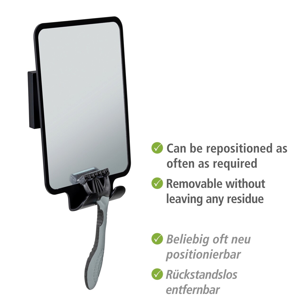 Oglinda anti-aburi Quadro Black, Wenko, 14x8x19.5 cm, sticla/ABS, negru