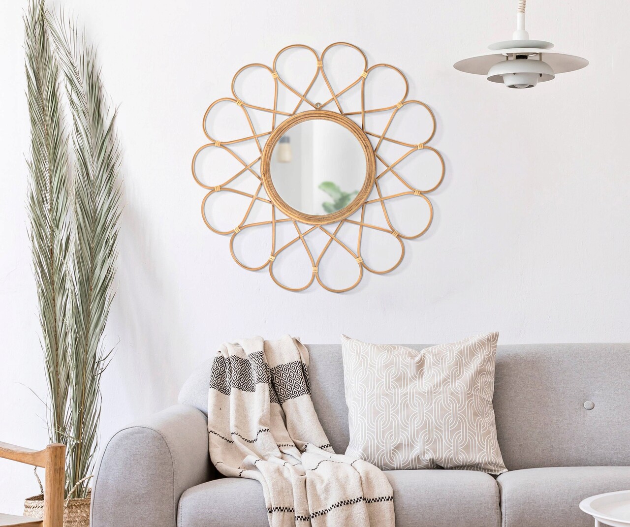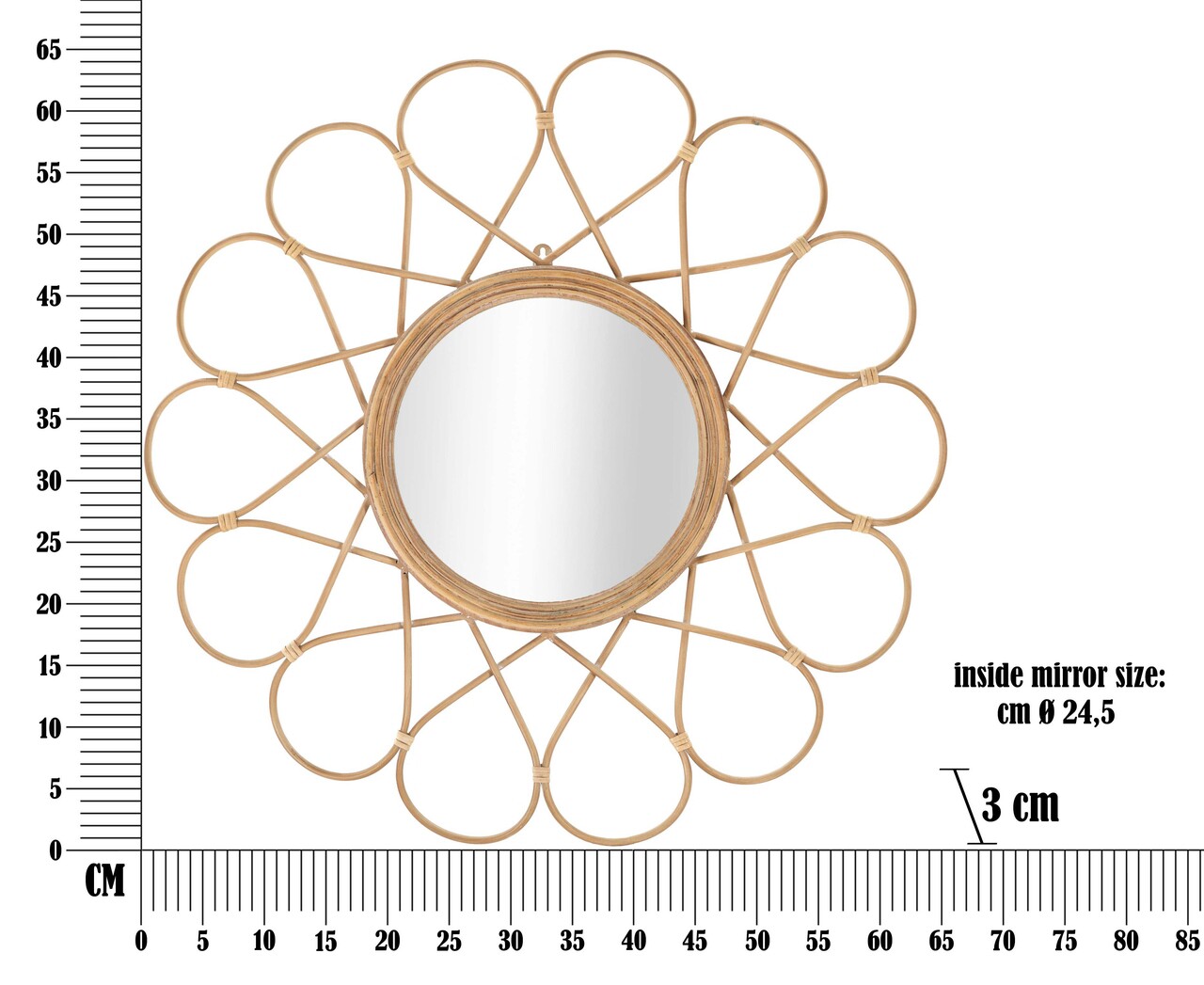 Oglinda rotunda de perete cu finisaj din ratan, design rotunjit si linii fluide care amintesc de petalele unei flori.
