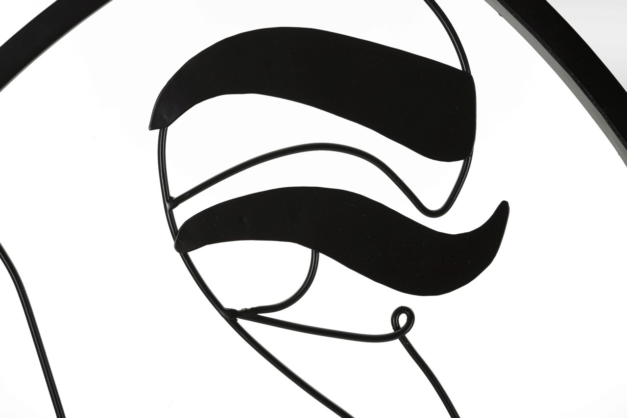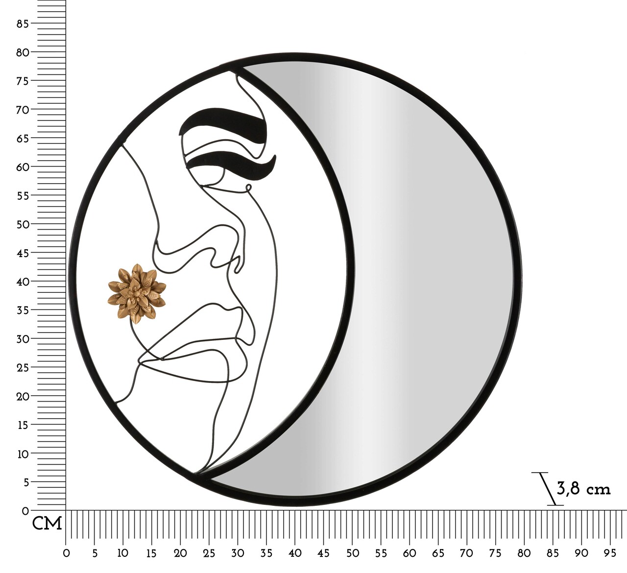 Oglinda de perete in forma de semiluna asezata intr-o structura rotunda decorata cu linii suple care formeaza un chip cu trasaturi care amintesc de arta cubista. Suprafata de oglindire: 27x76 cm.
