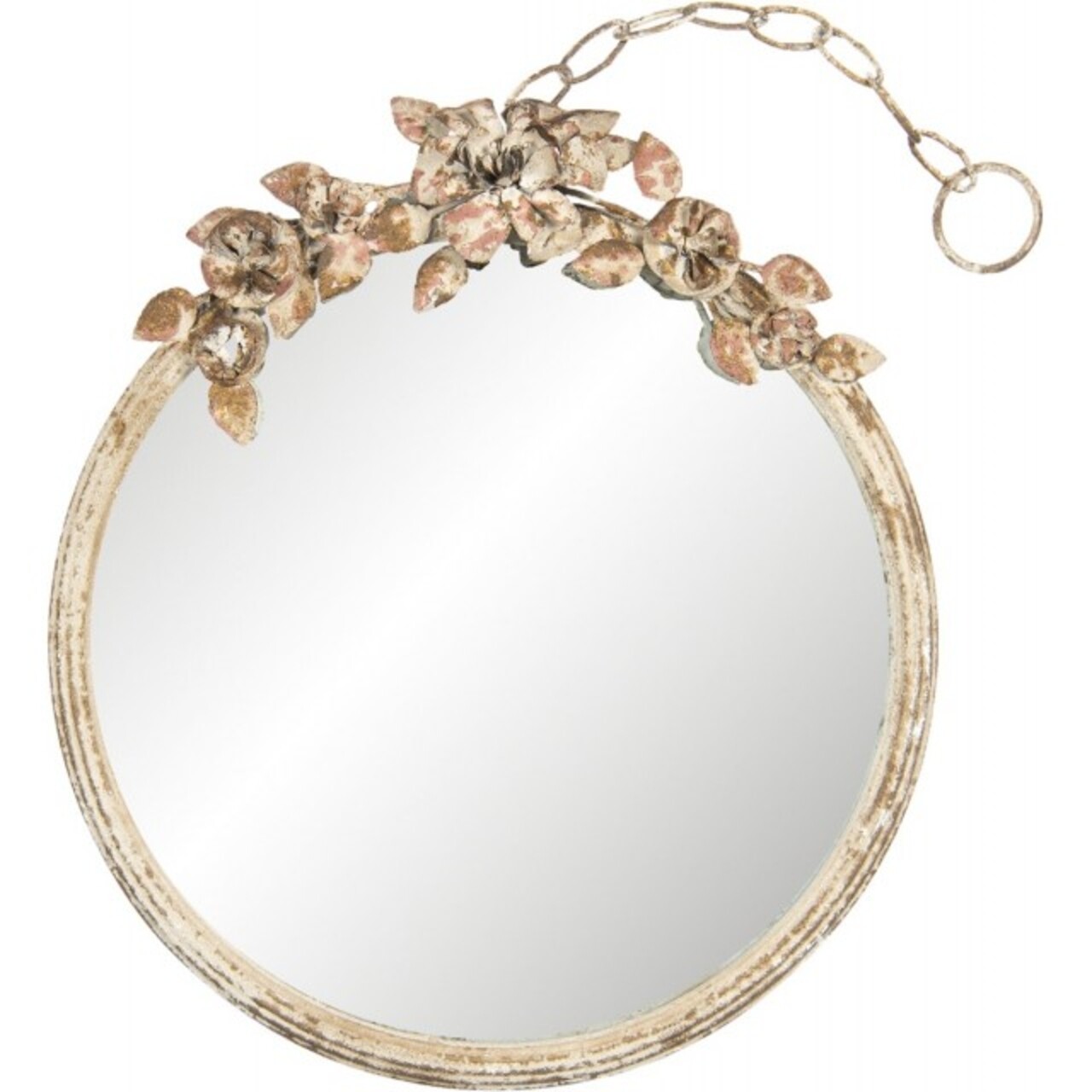 Oglinda cu rama vintage decorata cu trandafiri metalici si lant pentru agatat.