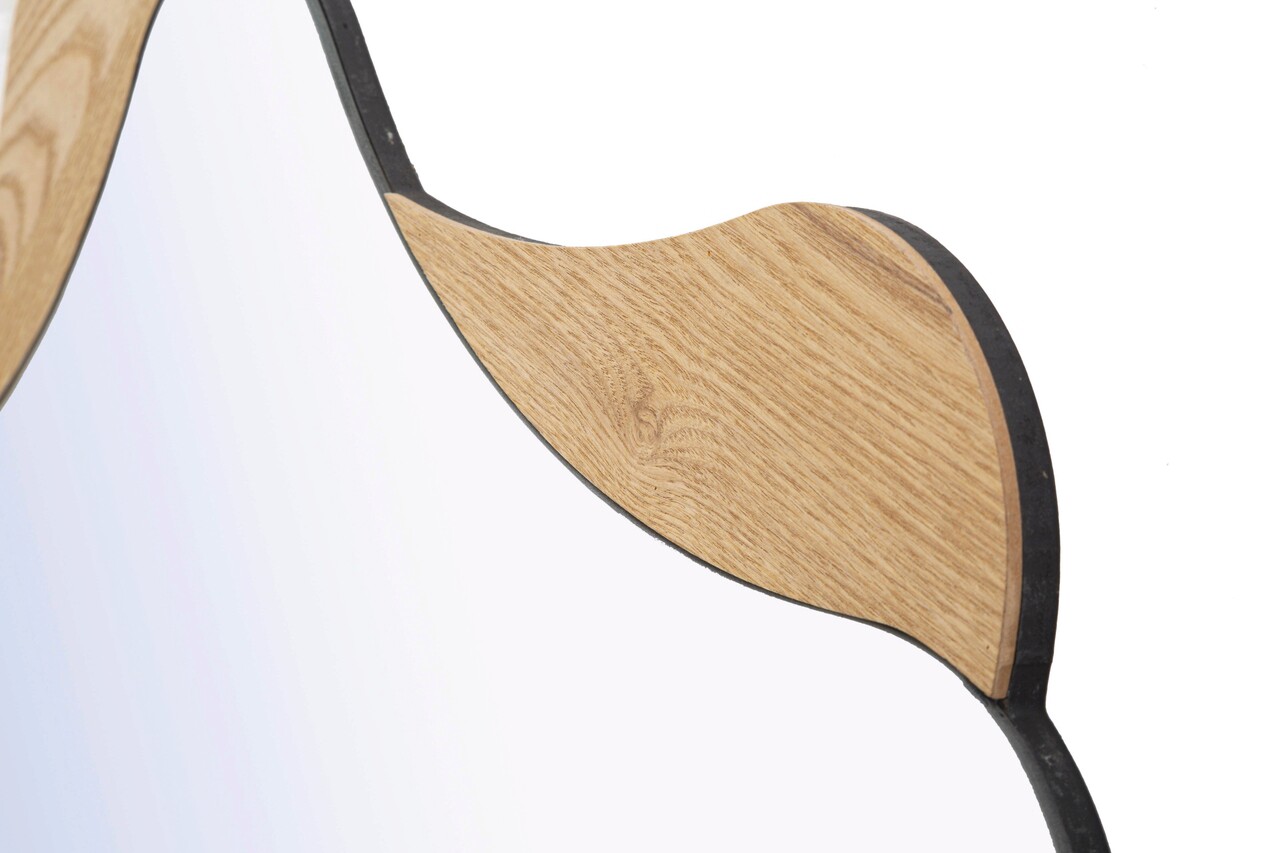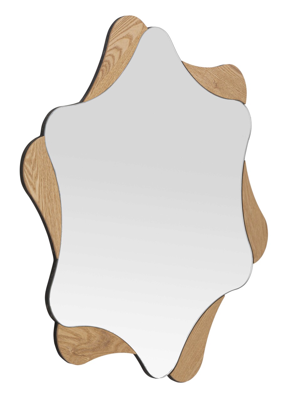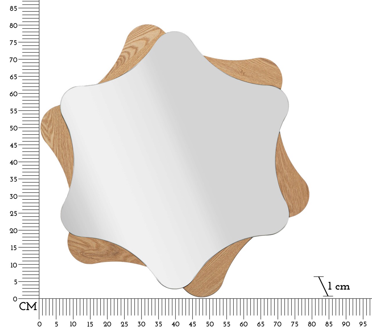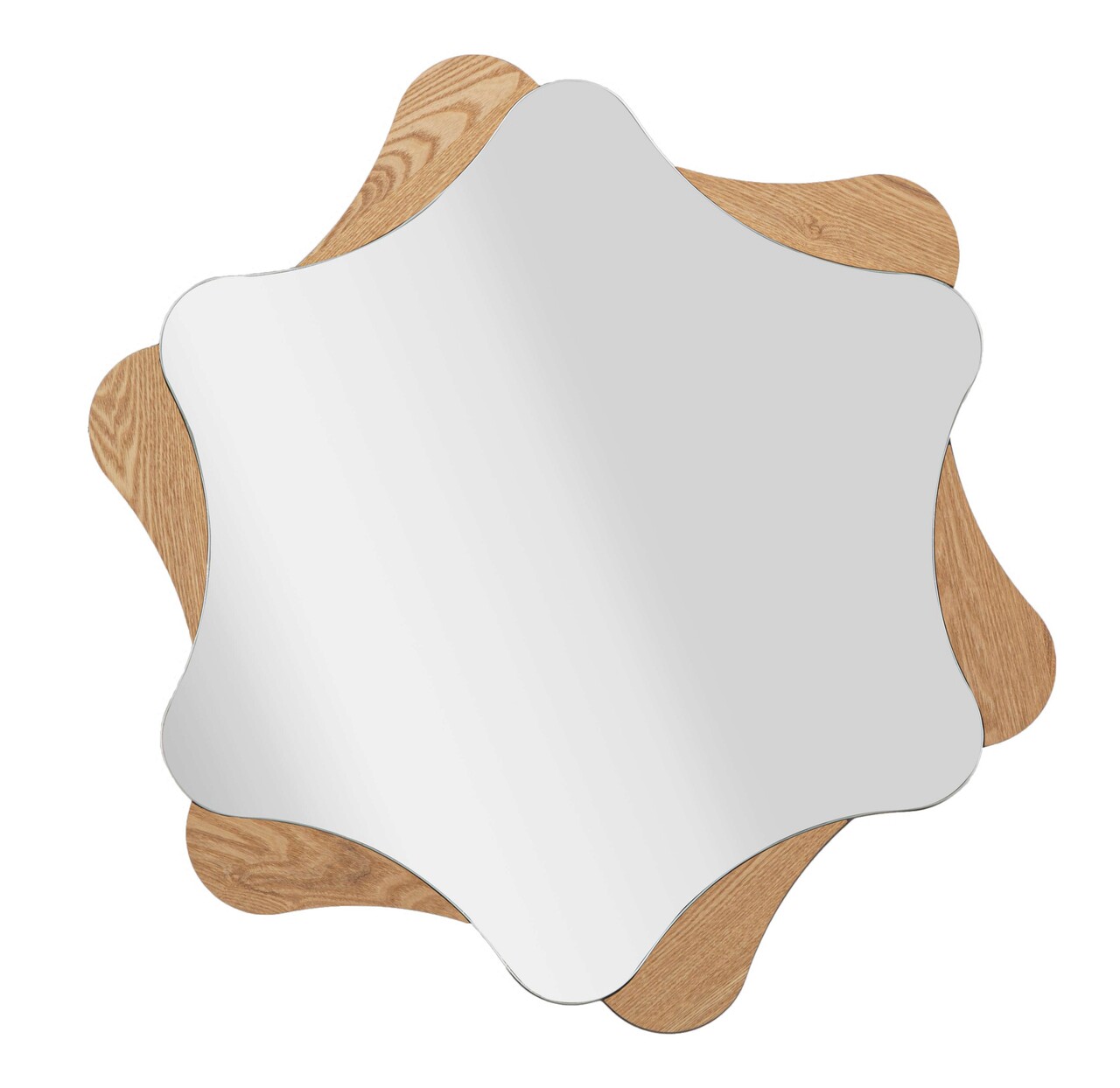 Oglinda de perete cu decoratiuni elegante din lemn, designul cu margini rotunjite aminteste de o stea. Suprafata de oglindire: 65x74 cm.
