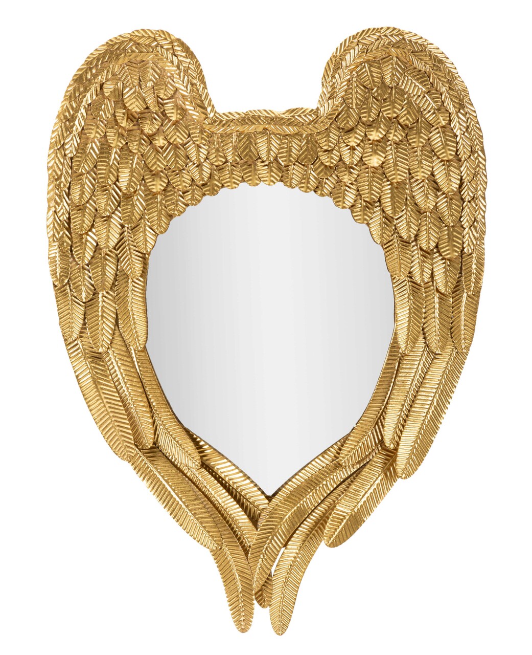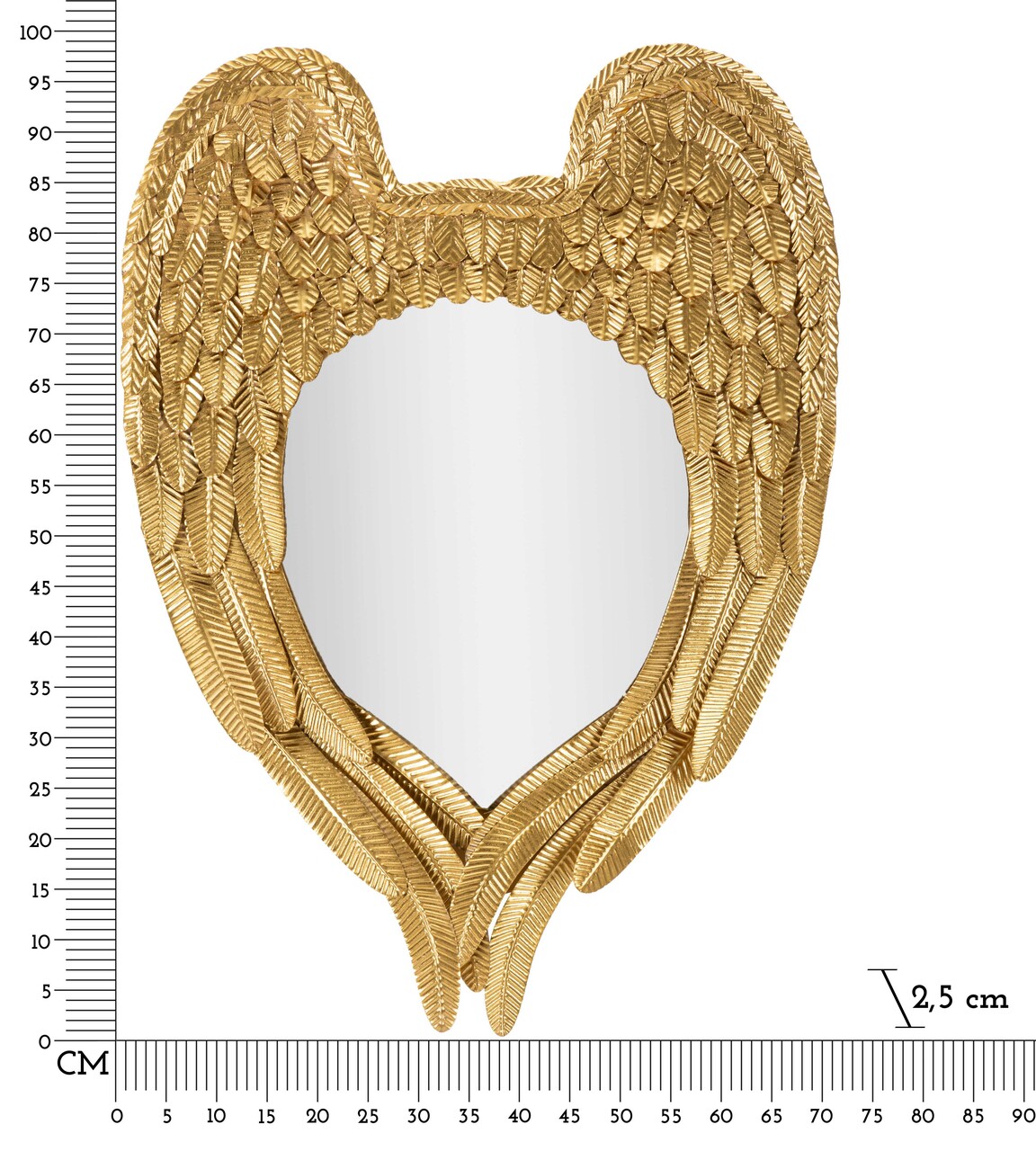 Oglinda de perete cu rama din metal auriu cu forma unei perechi de aripi. Suprafata de oglindire: 41x52 cm.