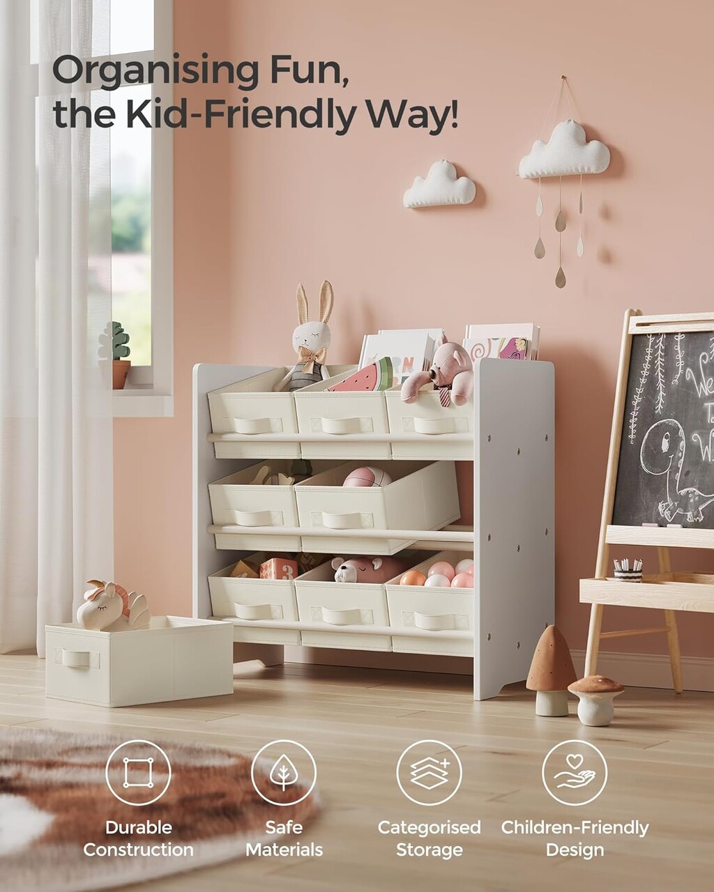 Ce primesti Un organizator de jucarii cu 3 niveluri, in nuanta alb-nor, prevazut cu 9 cutii textile detasabile. Ideal pentru orice spatiu, te ajuta sa mentii casa curata si organizata.