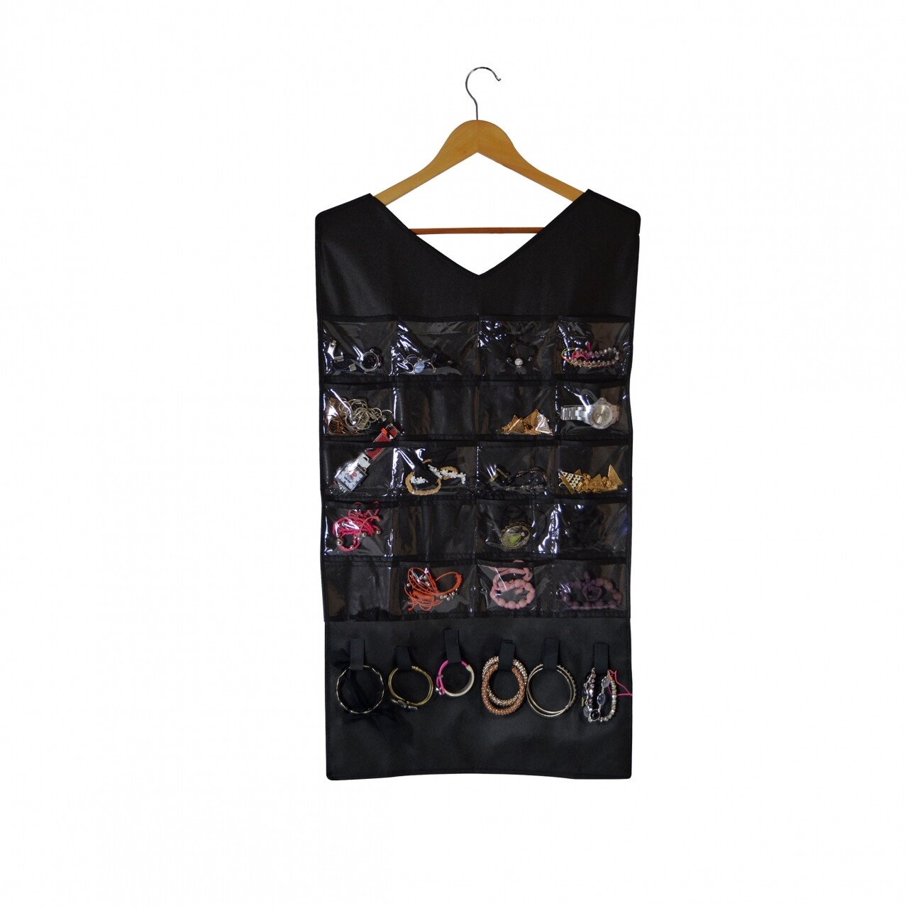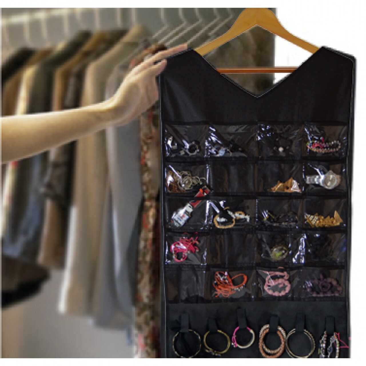 Organizatorul pentru accesorii Jocca este perfect pentru păstrarea în ordine a colierelor, brățărilor, inelelor, etc. Are 20 de compartimente transparente și 6 cârlige din textil. Datorită designului elegant îl puteți pune în garderoba dumneavostră, astfel economisiți spațiu.