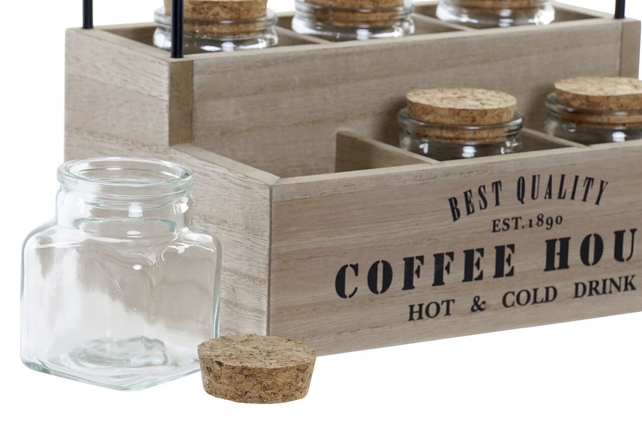 Acesta este prevazut cu sase borcanele, fiecare cu capac din pluta si un suport.
