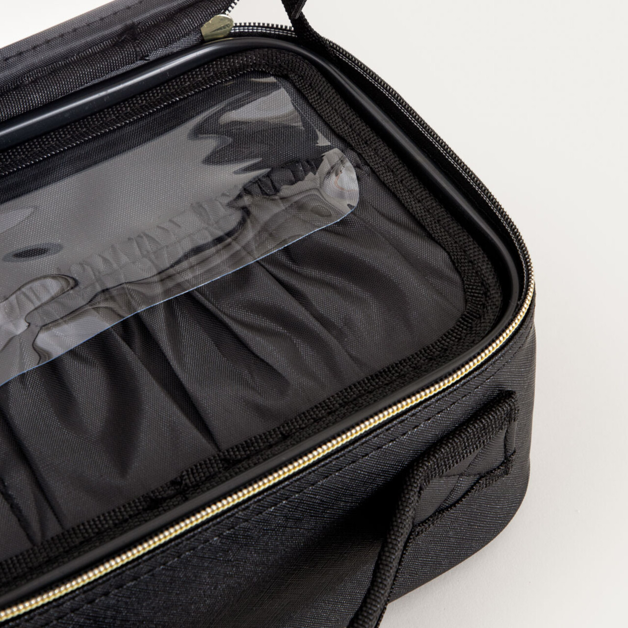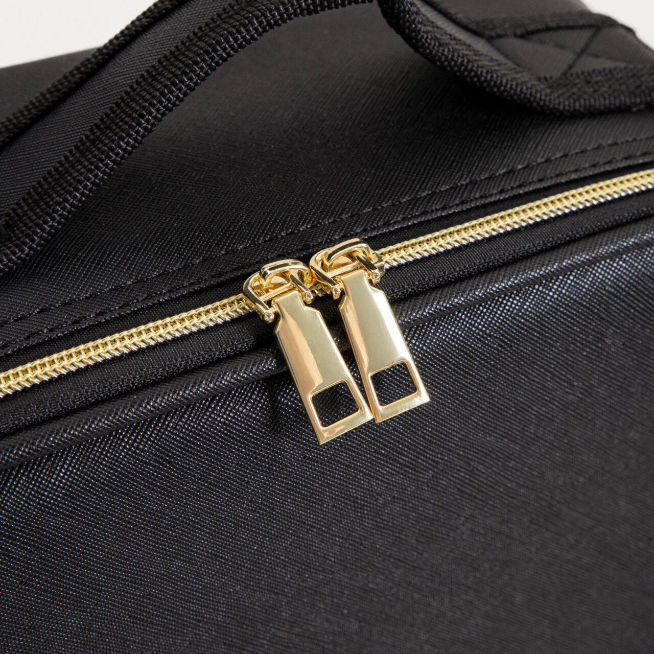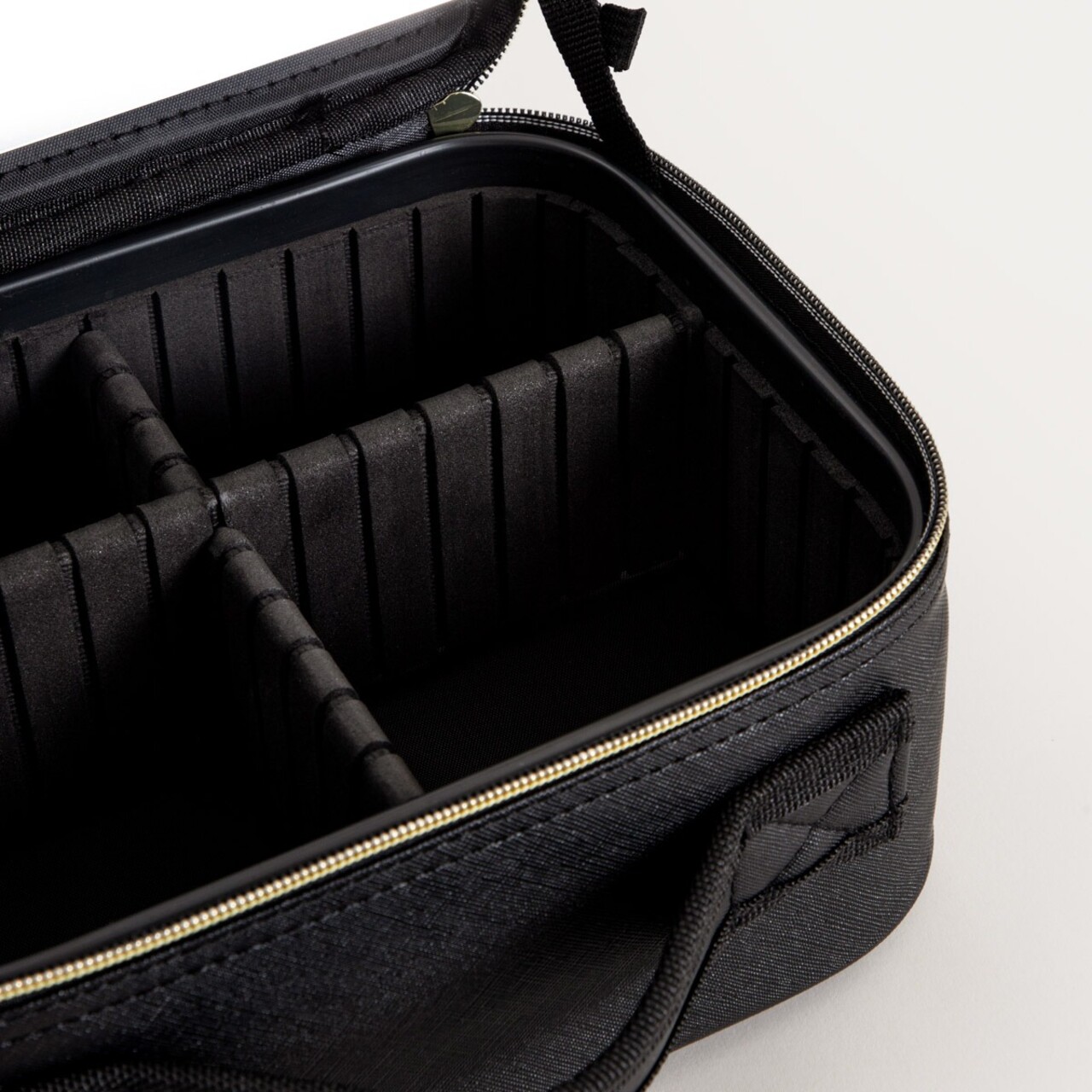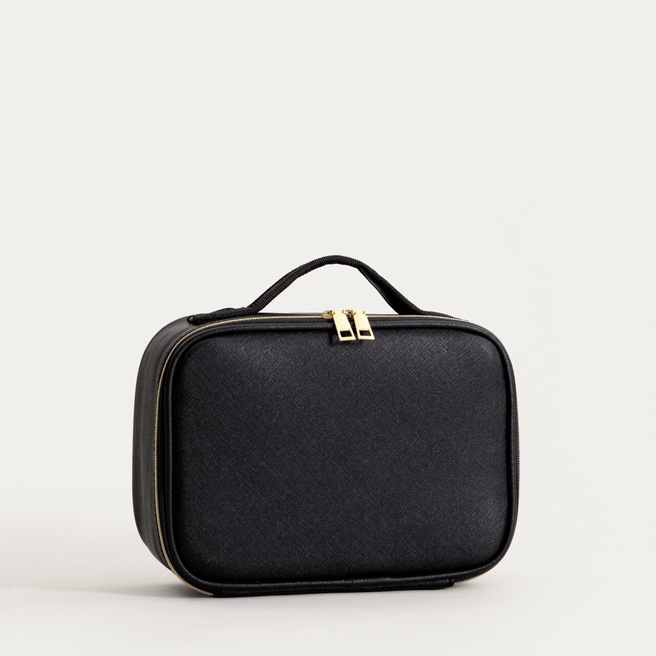 Forma sa eleganta si intunecata se potriveste atat pe masa de toaleta, cat si in bagajul de calatorie, iar structura sa rigida ii permite sa-si pastreze forma indiferent de continut. Trusa de cosmetice este prevazuta cu un maner confortabil si un fermoar elegant, de culoare aurie contrastanta.