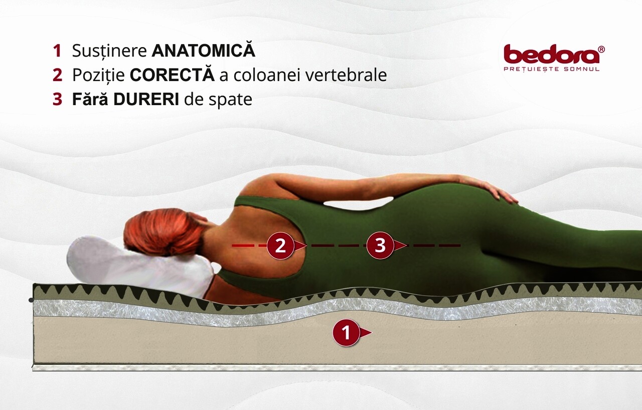 Este o saltea recomandata pentru toate pozitiile de dormit: pe spate, pe lateral si pe burta.