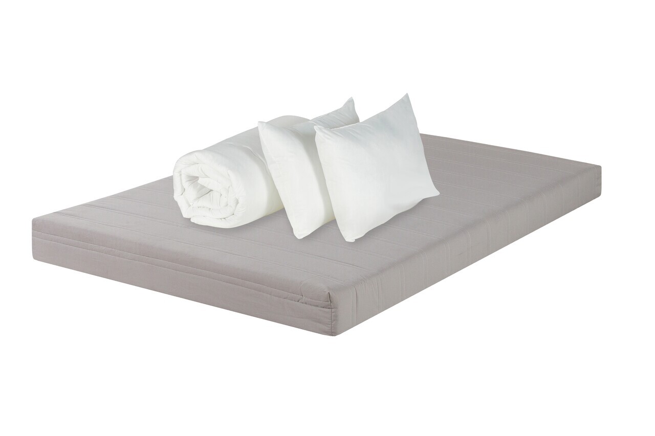 Pachetul Bedora Combo include trei produse de baza necesare pentru somn: o saltea, doua perne si o pilota. Structura saltelei este realizata dintr-un strat flexibil de 14 cm de spuma poliuretanica, care asigura o pozitie naturala pentru coloana in timpul somnului. Pentru o igiena adecvata, husa din fibra naturala de bumbac poate fi indepartata.