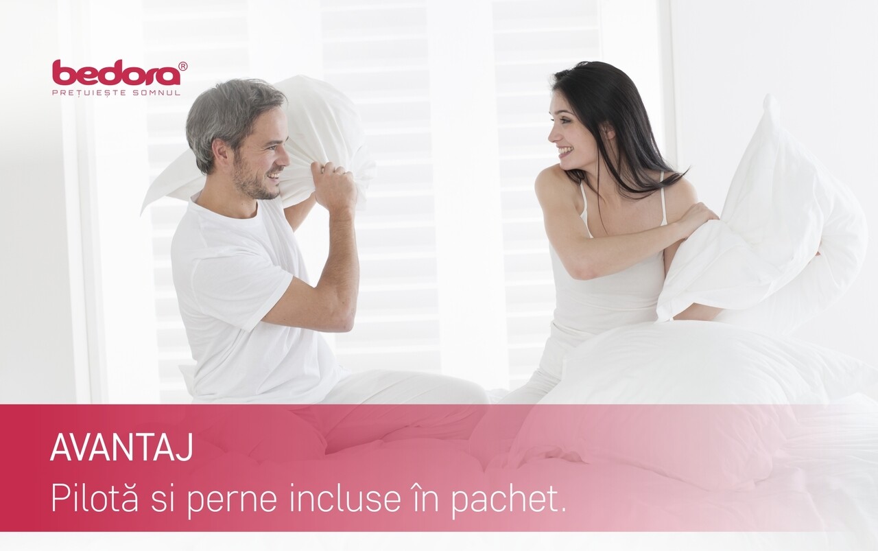 Pachetul Bedora Combo include trei produse de baza necesare pentru somn: o saltea, doua perne si o pilota. Structura saltelei este realizata dintr-un strat flexibil de 14 cm de spuma poliuretanica, care asigura o pozitie naturala pentru coloana in timpul somnului. Pentru o igiena adecvata, husa din fibra naturala de bumbac poate fi indepartata.