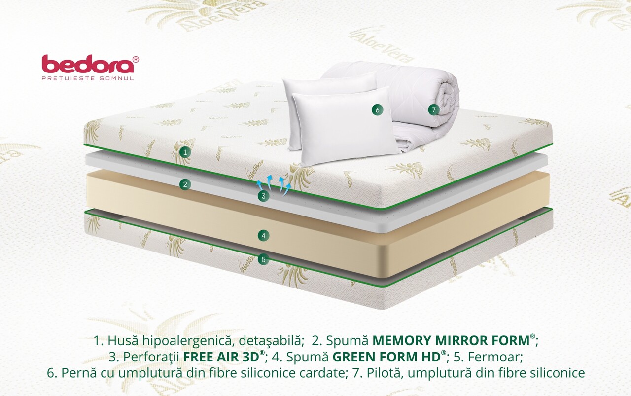 Setul Bedora Confort Relax Aloe format din saltea, perna si pilota reprezinta o solutie practica si utila ce poate indeplini orice exigenta.
