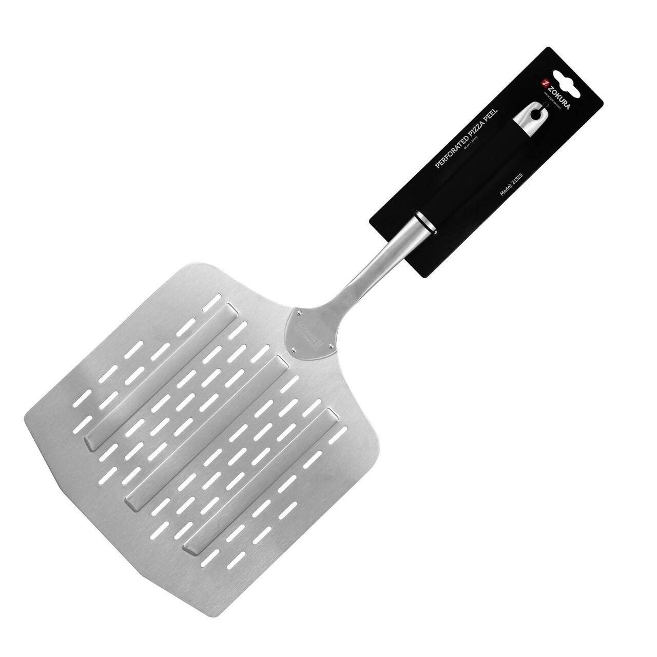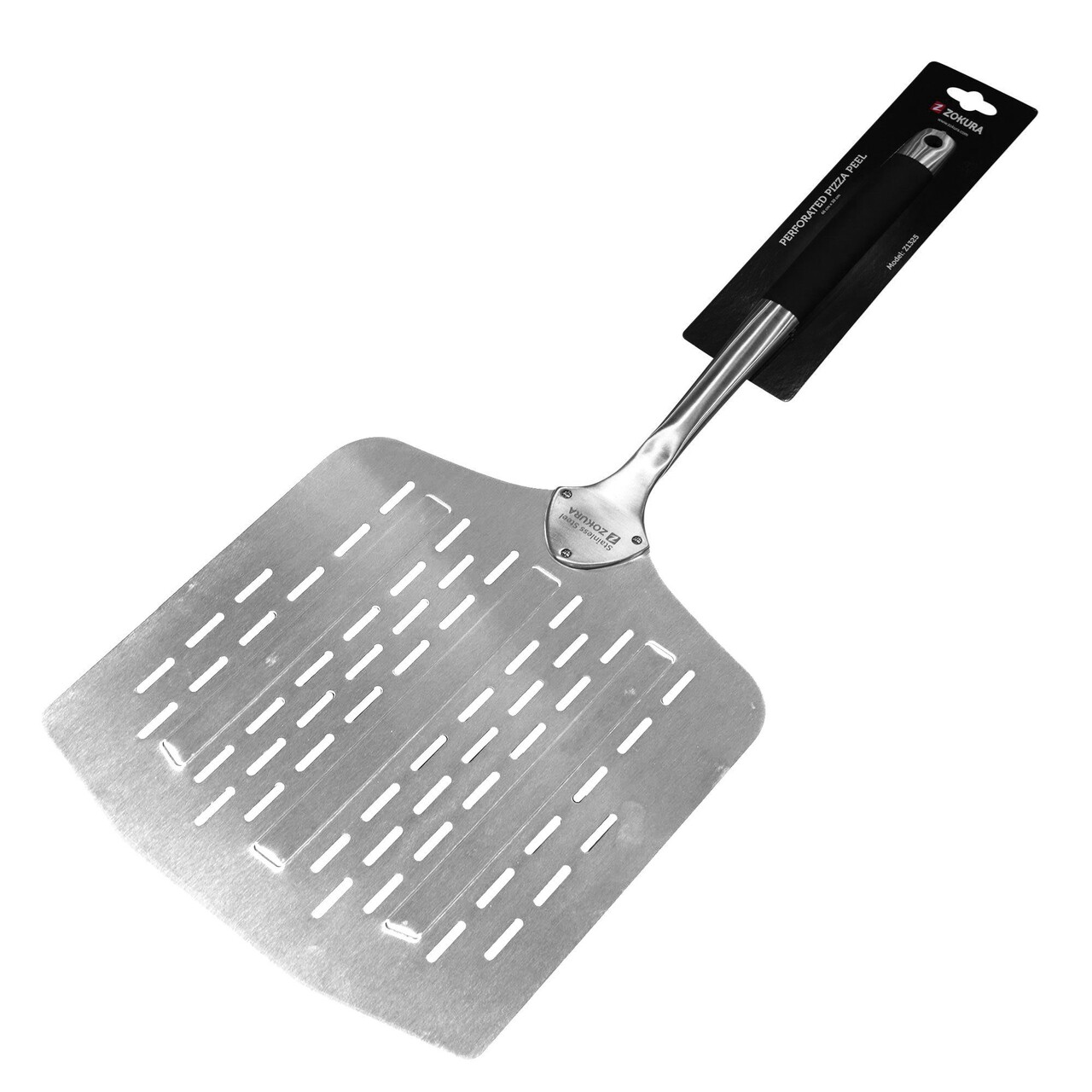 Paleta perforata pentru Pizza, Marca Zokura, Fabricata din Inox, Cu maner din cauciuc termoplastic.