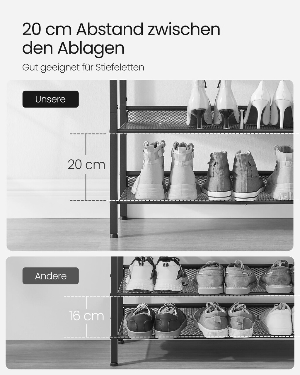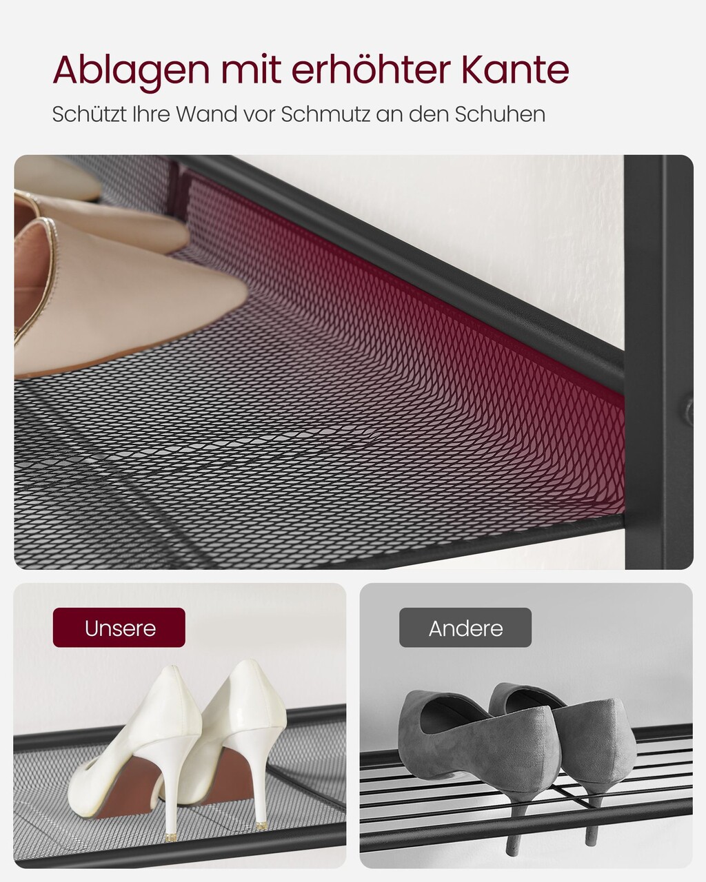 Suport de incredere Cu o capacitate maxima de incarcare de 27 kg pe suprafata de sus, poti aseza genti, rame foto, carti sau decoratiuni; fiecare raft din plasa suporta pana la 11 kg, astfel incat toti pantofii tai stau in siguranta.
