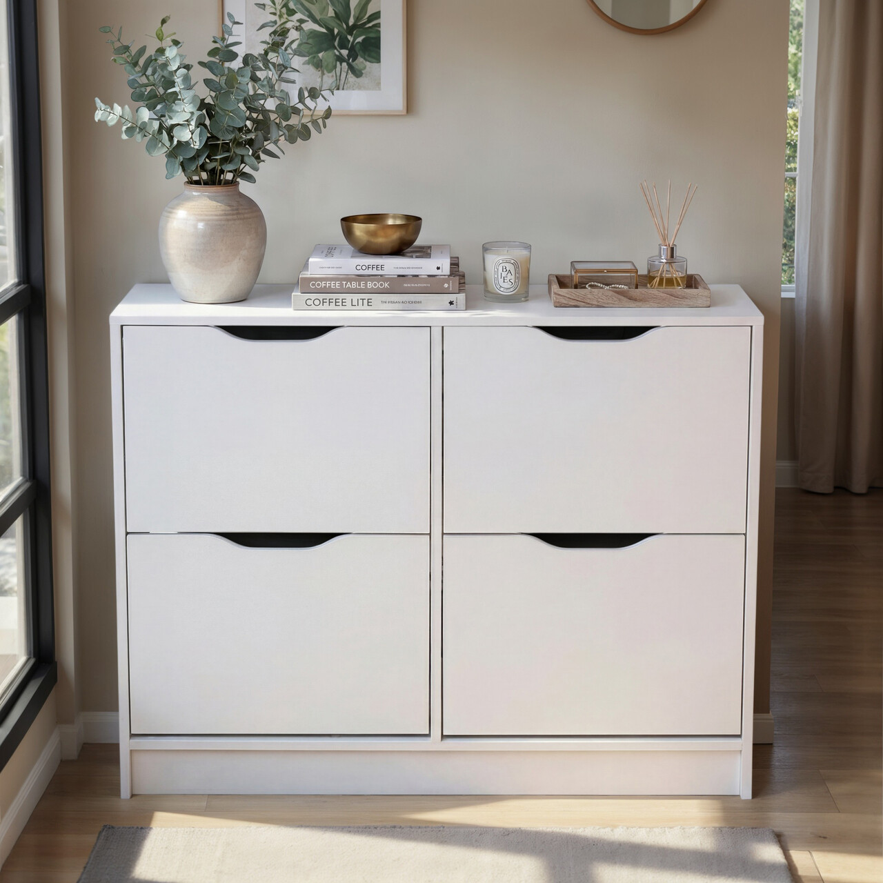 Suportul de pantofi WESTPHALEN va fi ideal pentru apartamentul sau casa dumneavoastra. Ocupa putin spatiu si ofera spatiu maxim de depozitare pentru incaltaminte. Dimensiunile sale sunt perfecte pentru intrare sau hol. Acest suport de pantofi are patru usi cu balamale. In spatele fiecarei usi, puteti depozita aproximativ doua perechi de pantofi.