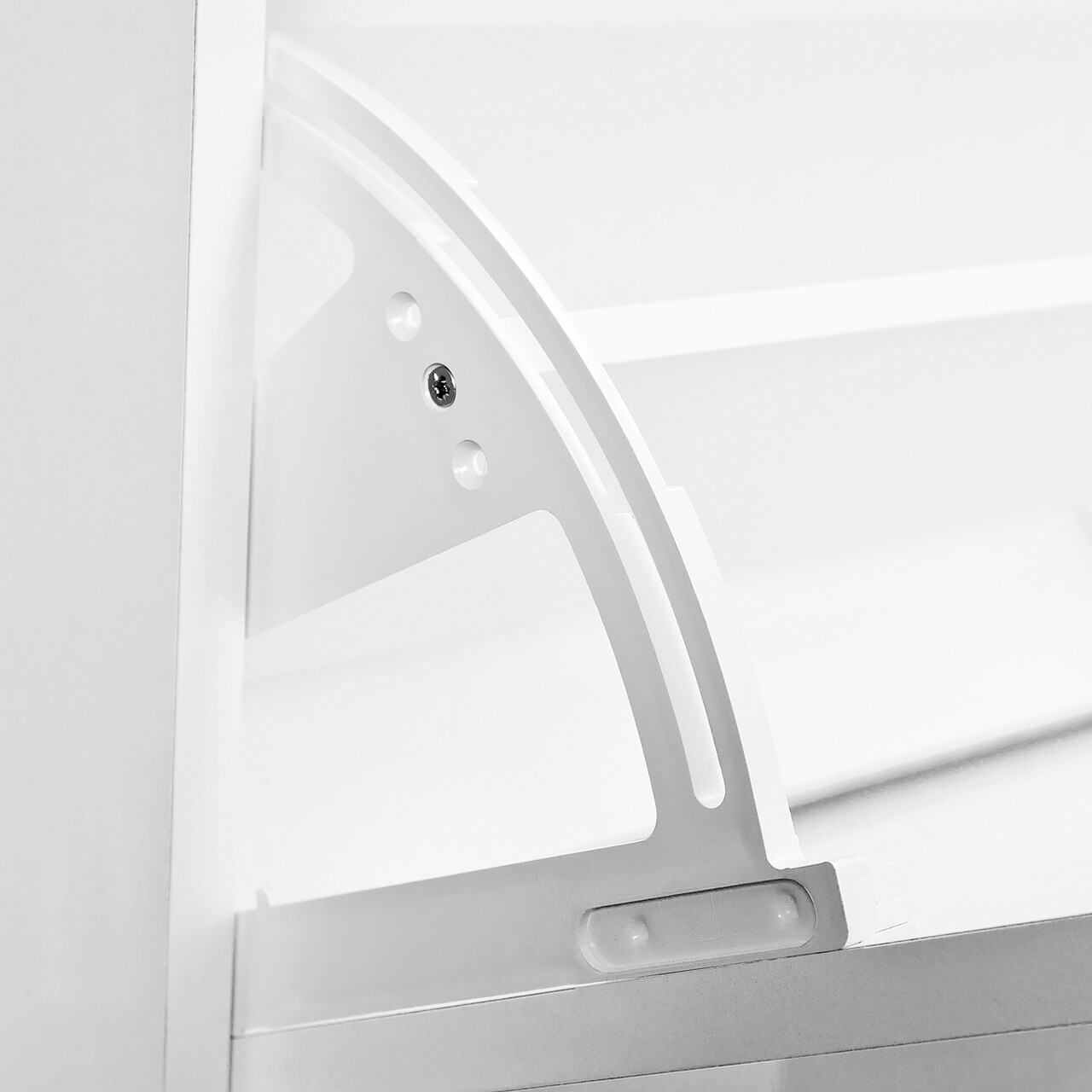 Dulapurile de pantofi albe sunt fabricate din PAL acoperit cu plastic (KFB) si au un strat de melamina.