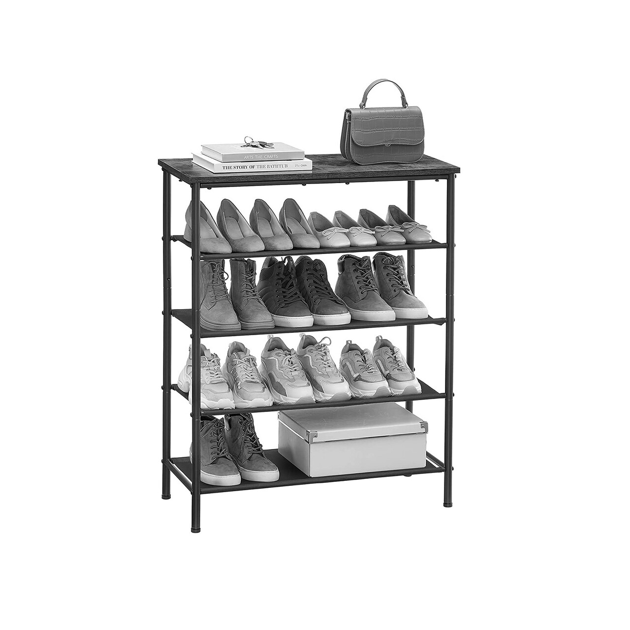 Un raft pentru pantofi cu blat din PAL si 4 rafturi din material textil, instructiuni ilustrate, sistem anti-rasturnare si o modalitate stilata de a-ti pastra pantofii organizati.