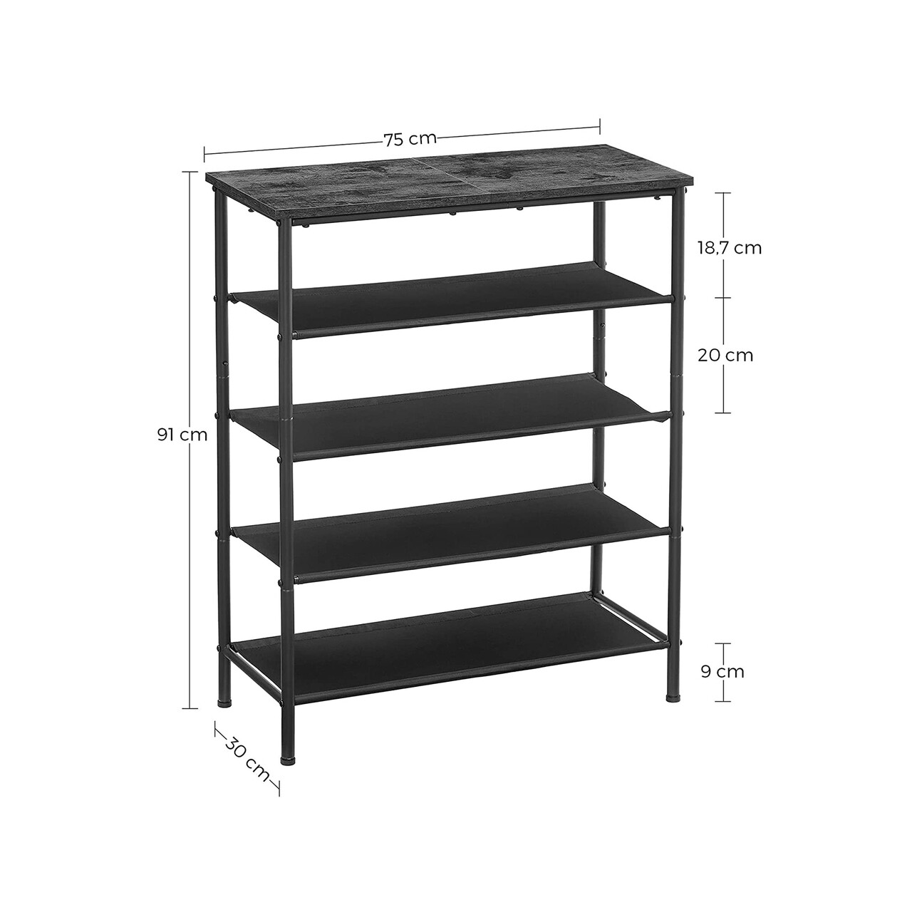 Blatul din PAL sustine genti, plante mici sau decoratiuni. Cele 4 rafturi deschise din material textil ofera spatiu generos pentru pantofi.