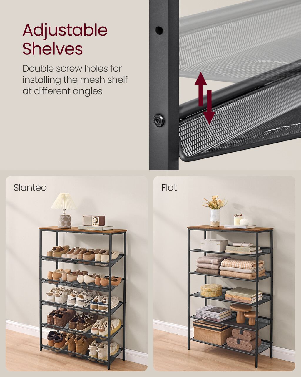 Aranjare flexibila: Rafturile pot fi ajustate in diferite unghiuri pentru a se potrivi mai multor tipuri de incaltaminte.