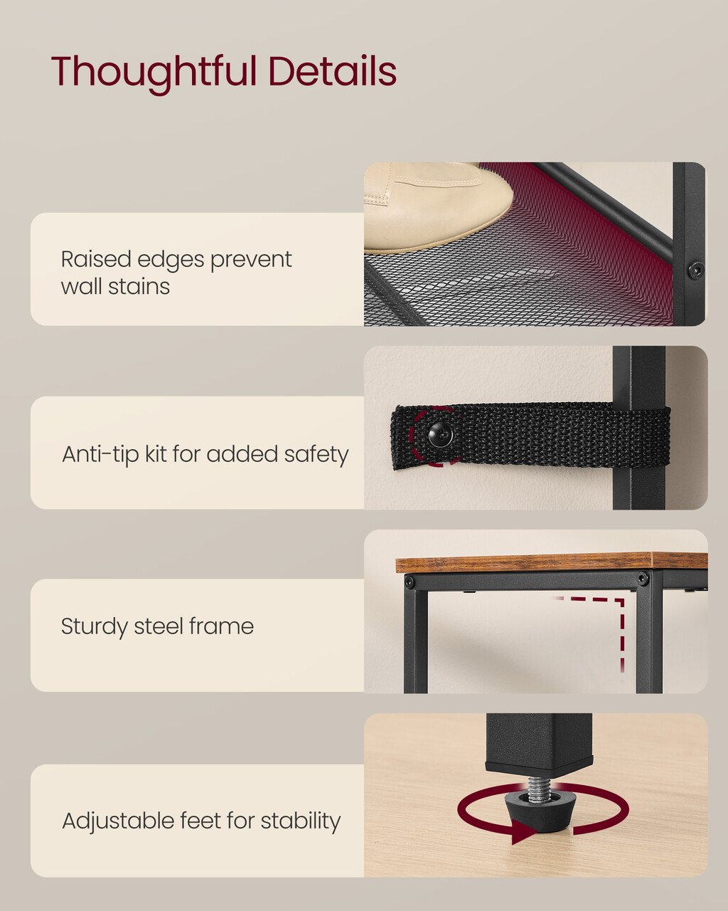 Structura stabila: Pastreaza incaltamintea si accesoriile in siguranta pe un raft solid si fiabil.