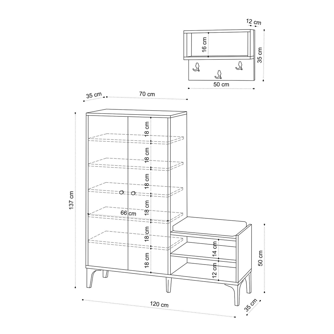 Setul este format din pantofar: 120 x 35 x 137 cm (Lxlxh) si cuier 50 x 12 x 35 cm (Lxlxh).