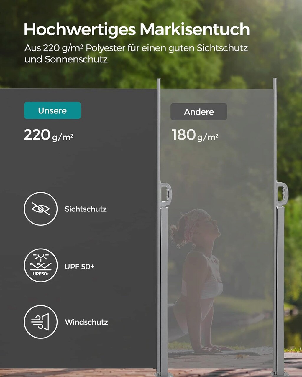 Panza pentru copertina Premium: Panza din poliester de 220 gsm va protejeaza perfect intimitatea. TÜV Rheinland confirma, de asemenea, rezistenta culorilor tesaturii (raportul de testare nr. 180115798a 001; detinatorul raportului: furnizorul).