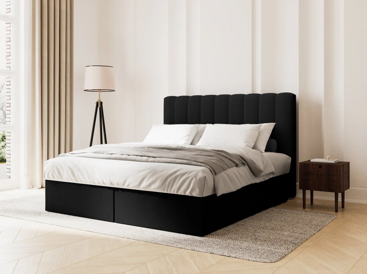 Pat continental cu saltea, topper si lada depozitare, 180x200 cm, Micadoni Home, Kelp-138, tesatura structurata chenille, negru