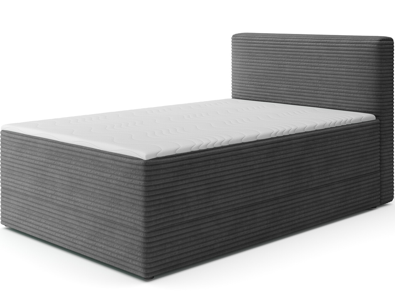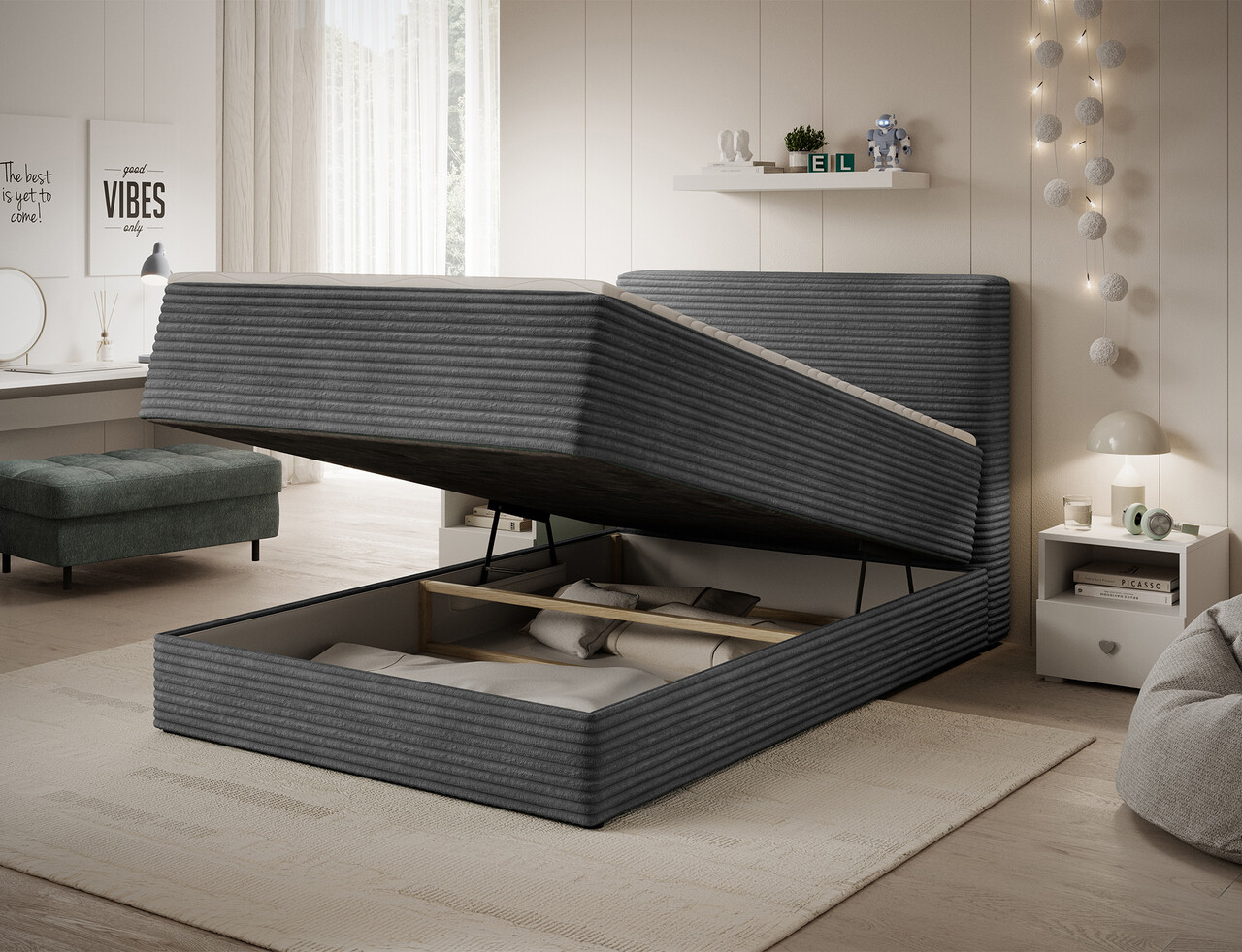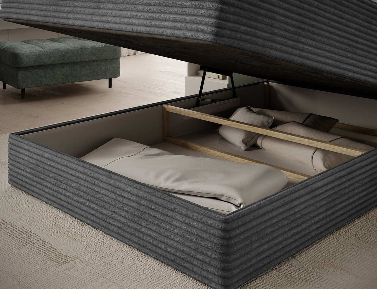 Pat continental tapitat cu lada depozitare, 140x200 cm, ELTAP, Alamito, lemn/poliester, gri inchis