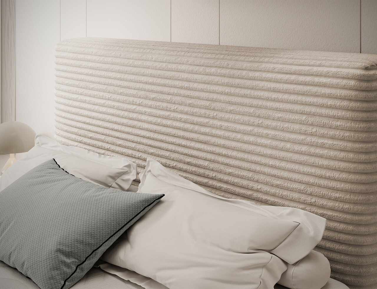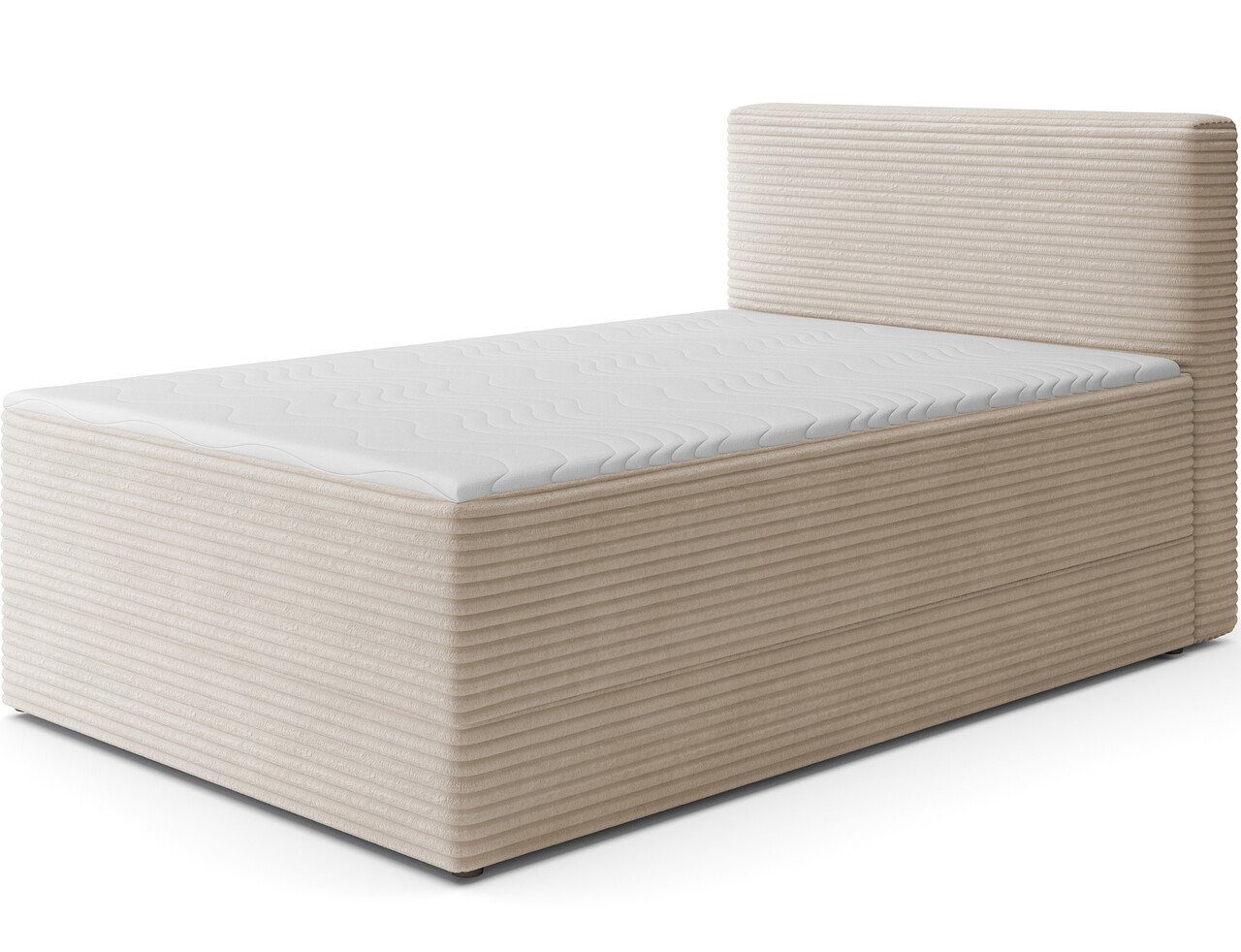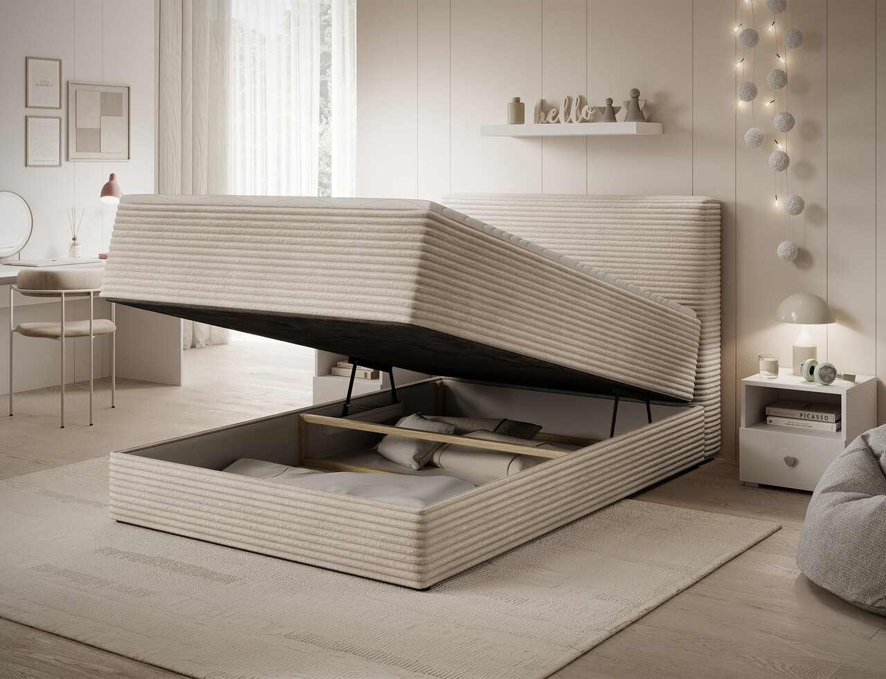 Pat continental tapitat cu lada depozitare, 140x200 cm, ELTAP, Alamito, lemn/poliester, bej deschis