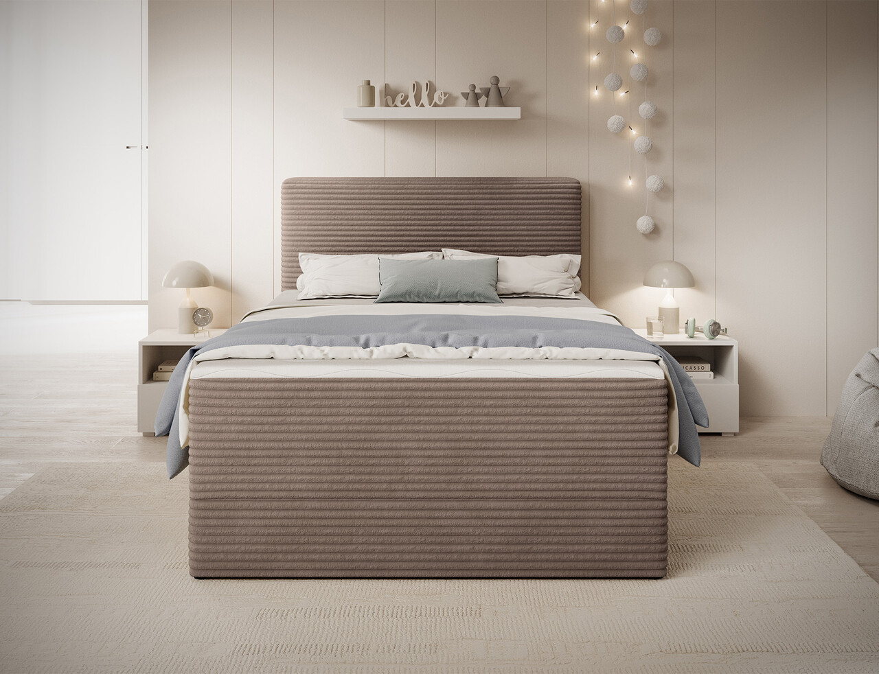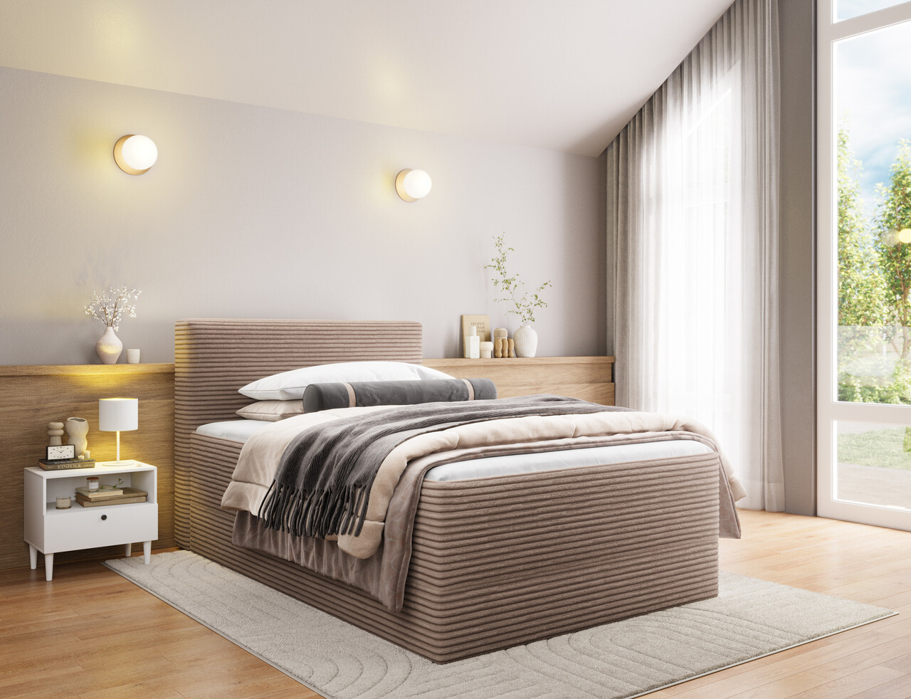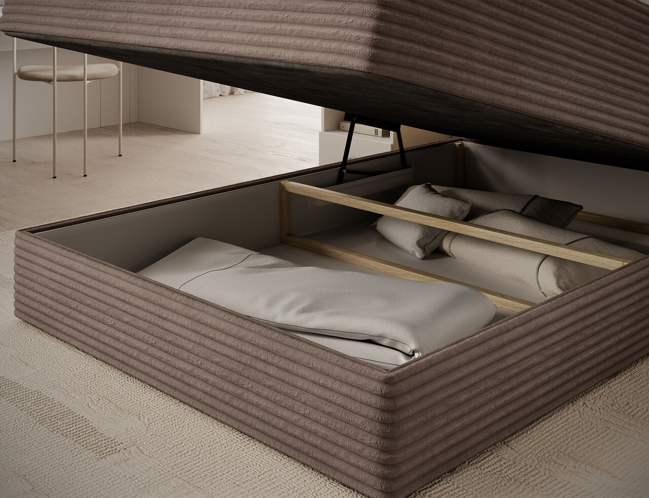 Pat continental tapitat cu lada depozitare, 140x200 cm, ELTAP, Alamito, lemn/poliester, maro deschis