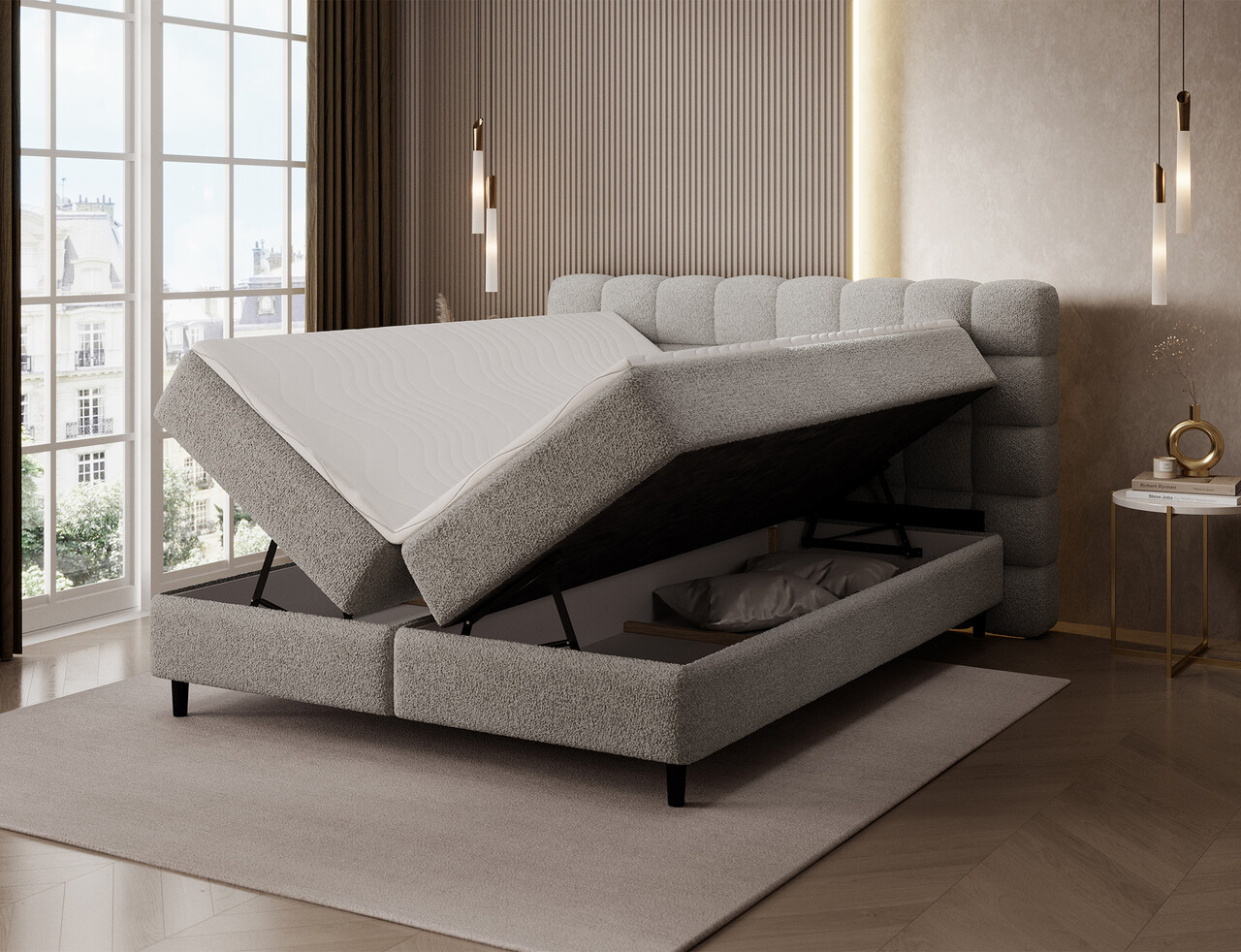 Pat continental tapitat cu lada depozitare, 140x200 cm, ELTAP, Camma, lemn/poliester, maro deschis