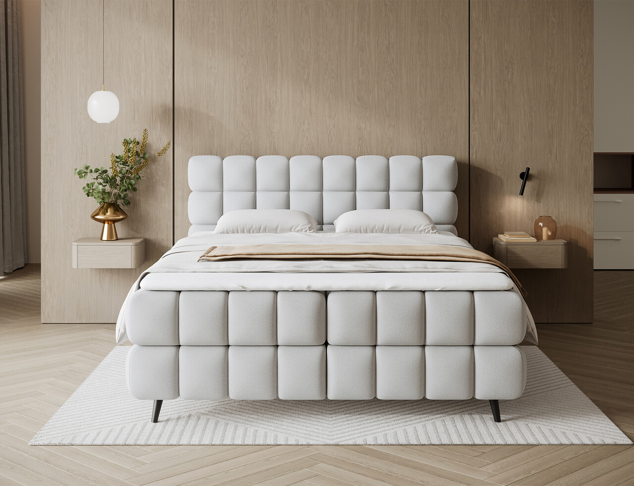 Pat continental tapitat cu lada depozitare, 140x200 cm, ELTAP, Sabeno, lemn/poliester, gri deschis