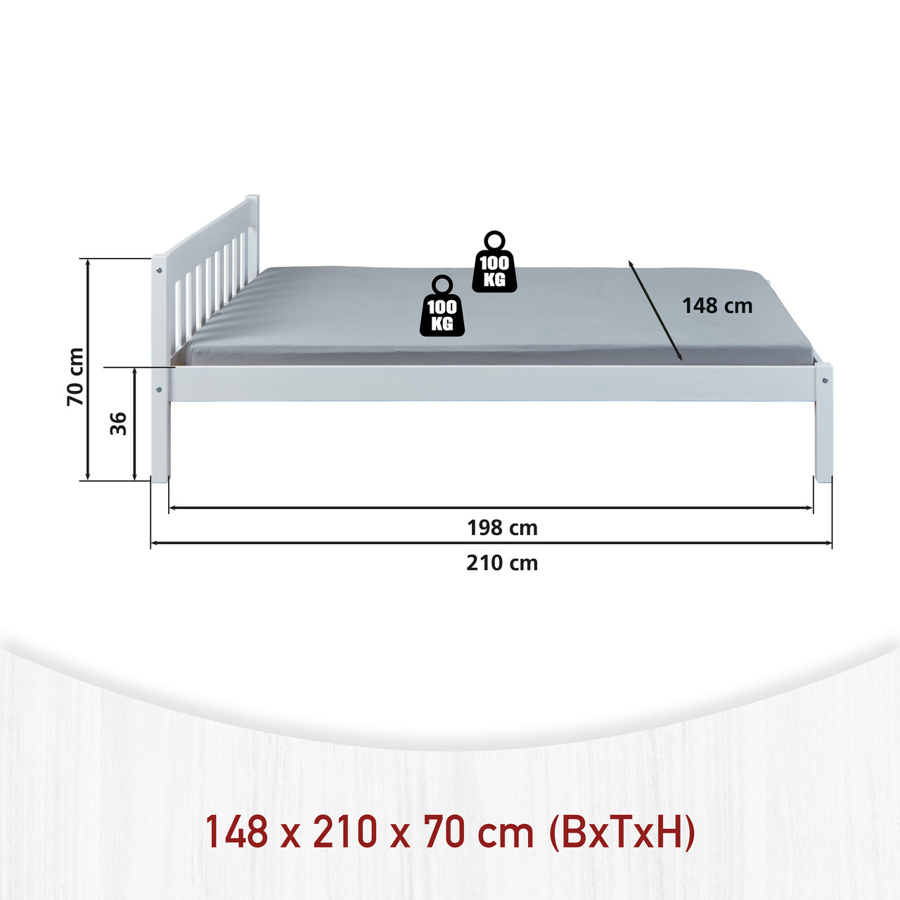Patul dublu Vilmar este disponibil in diferite dimensiuni. Acest pat ofera spatiu amplu pentru doua persoane. Datorita utilizarii lemnului masiv, patul dublu Vilmar promite o stabilitate exceptionala. Vilmar ofera relaxare si energie reinnoita pentru inceputul zilei! Patul dublu creeaza o atmosfera calda si confortabila si o experienta de somn cu adevarat odihnitoare. Acest pat dublu elegant se caracterizeaza prin constructia sa solida si designul atemporal. Constructia din lemn masiv asigura o stabilitate ridicata si o durabilitate exceptionala. Patul dublu lacuit alb este usor de intretinut si hidrofug. Fibra naturala a lemnului este vizibila prin lacul alb. Lemnul masiv de pin utilizat la fabricarea patului Vilmar indeplineste cele mai recente standarde europene de calitate. Acest pat dublu robust impresioneaza prin durabilitatea sa ridicata si manopera solida. Somiera cu sipci inclusa: Nu.