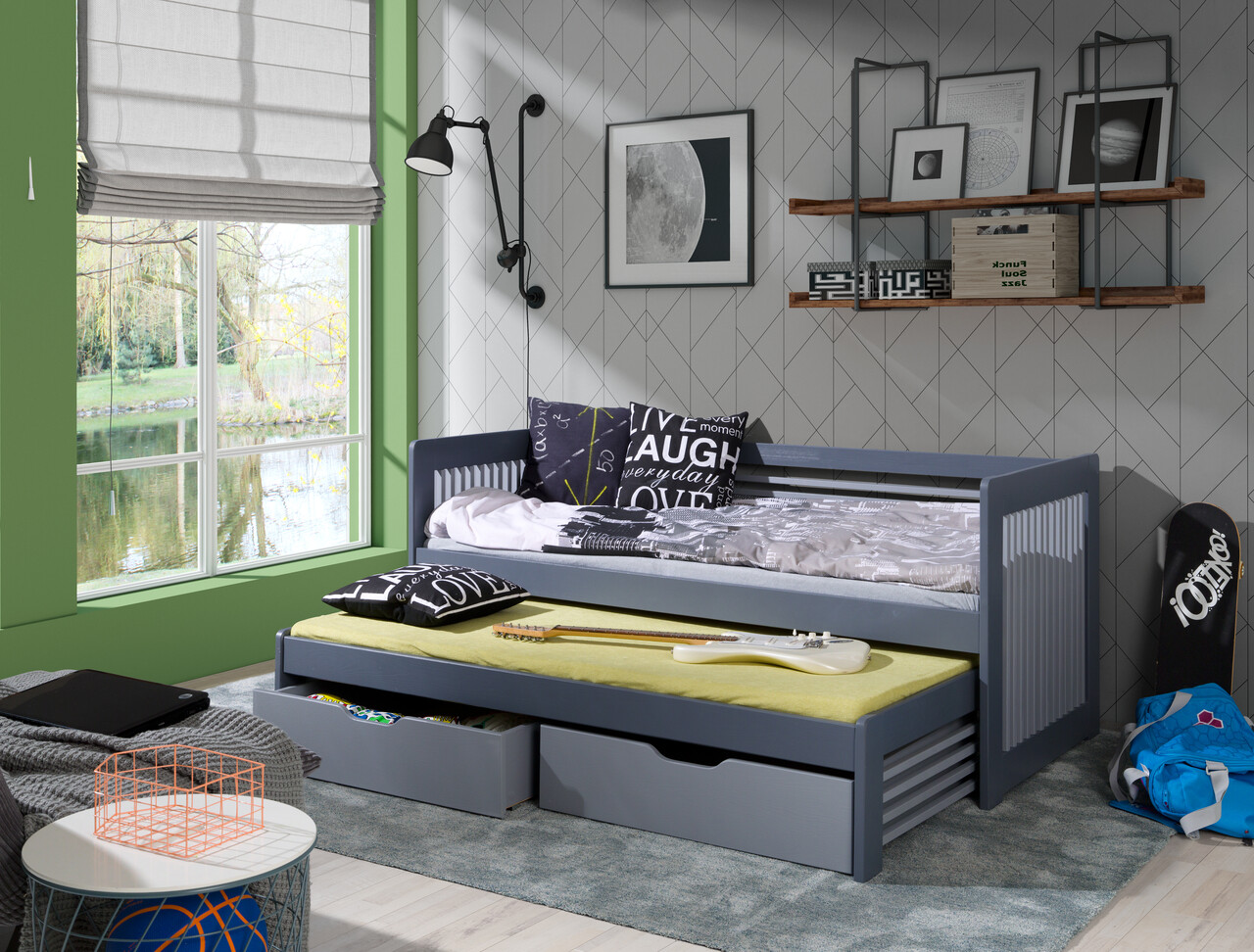 Pat etajat pentru camera copilului Anatol, Meblobed, 90x200 cm, cu doua sertare, lemn de pin, grafit