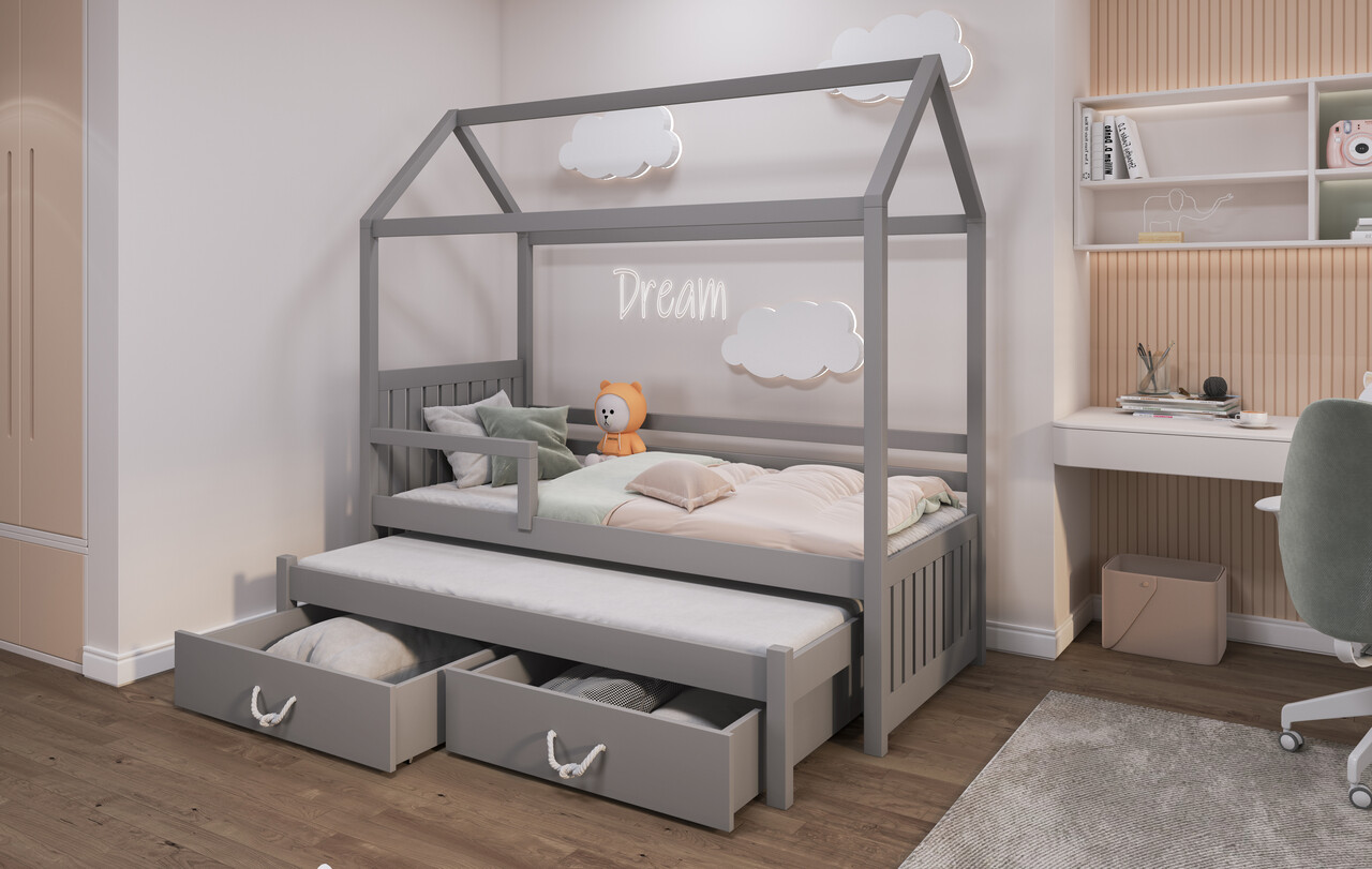 Pat etajat pentru camera copilului Jonas II, Meblobed, 80x180 cm/70x180 cm, cu doua sertare, lemn de pin, gri