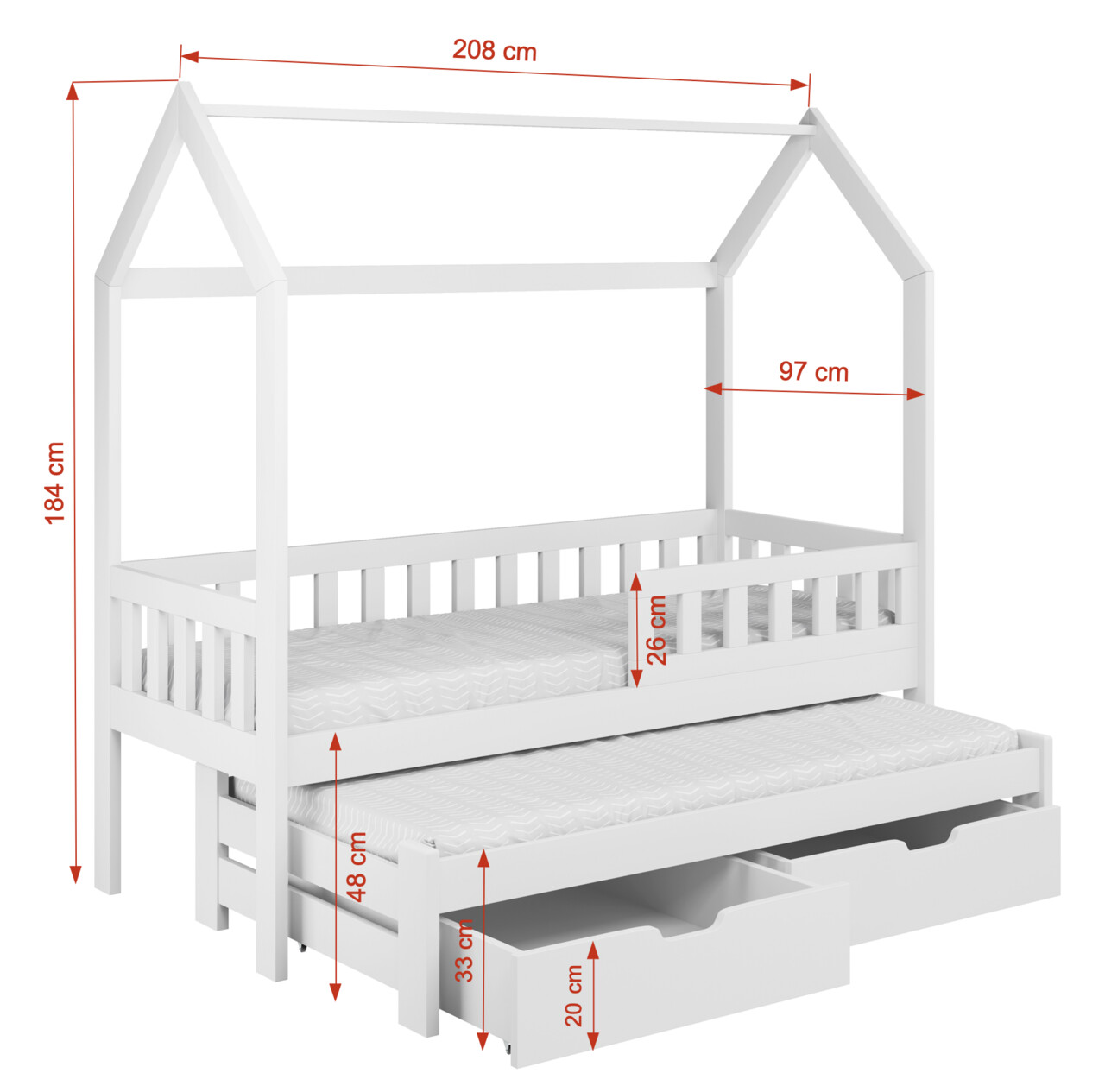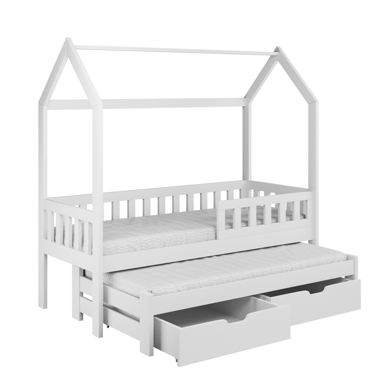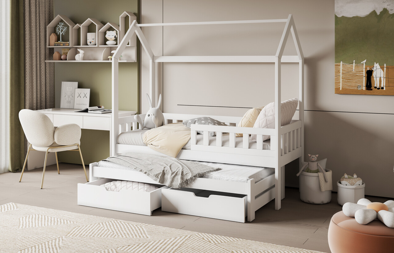 Pat etajat pentru camera copilului Tymon, Meblobed, 90x200 cm, cu doua sertare, lemn de pin, alb