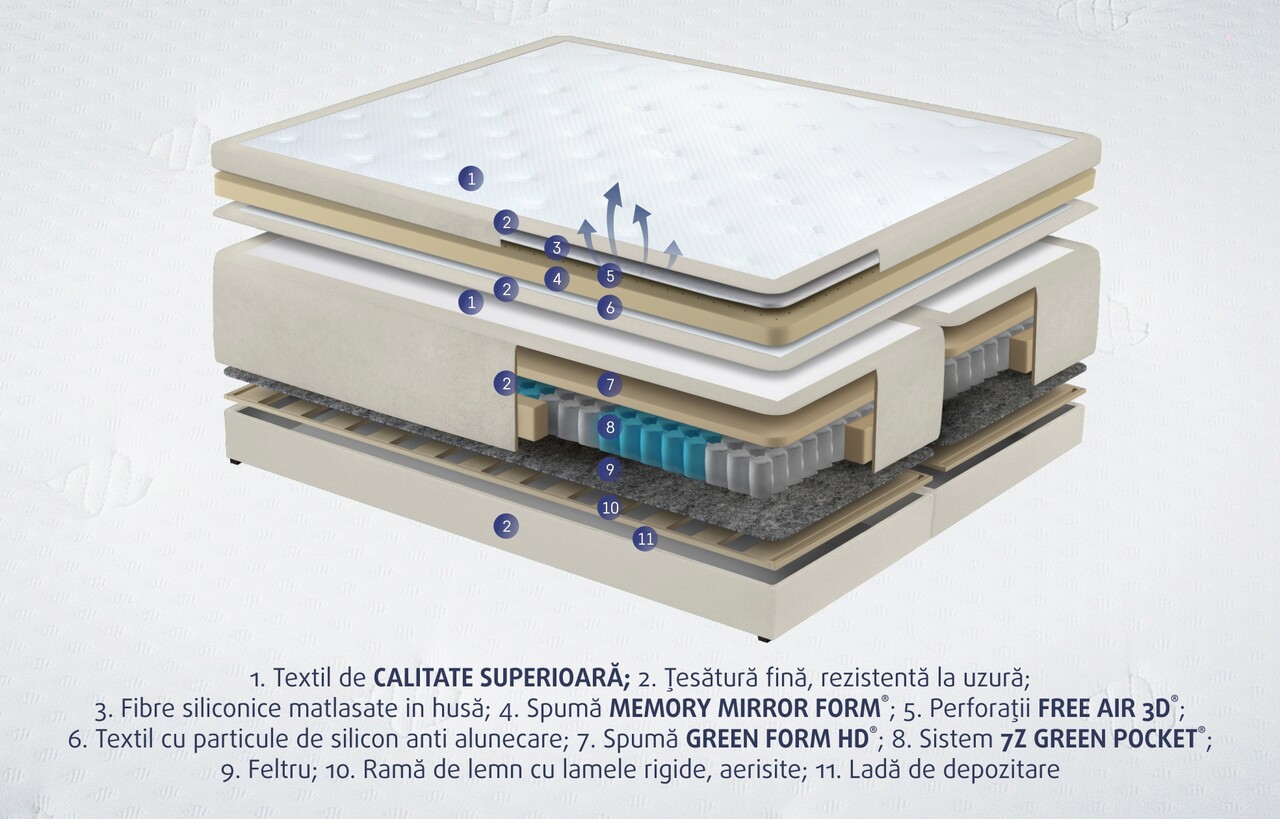 Baza este facuta din lemn masiv, uscat in mediu controlat pentru a crea un cadru stabil cu durabilitate ridicata care sa nu scartaie in timp. Arcurile impachetate individual 7Z Green Pocket® din interiorul boxului asigura o stabilitate crescuta si un confort ortopedic si anatomic excelent.