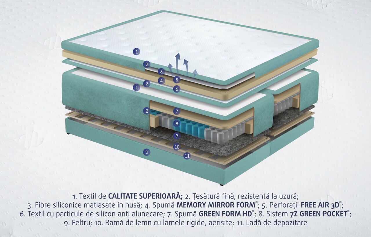 Baza este facuta din lemn masiv, uscat in mediu controlat pentru a crea un cadru stabil cu durabilitate ridicata care sa nu scartaie in timp. Arcurile impachetate individual 7Z Green Pocket® din interiorul boxului asigura o stabilitate crescuta si un confort ortopedic si anatomic excelent.