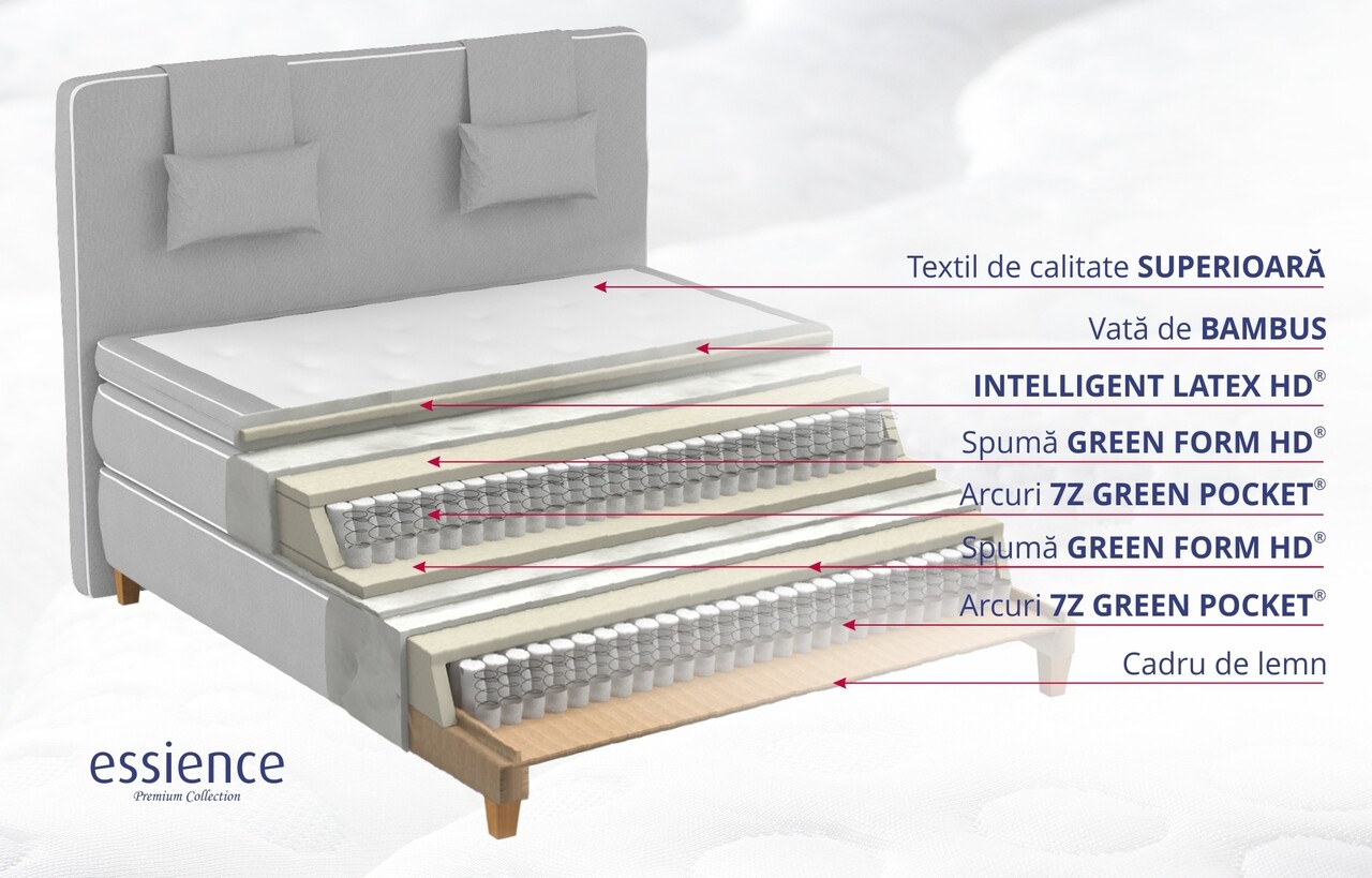 Baza, conceputa din doua somiere pentru a usura montajul si curatenia, este facuta din lemn masiv, uscat in mediu controlat pentru a crea un cadru stabil cu durabilitate ridicata. Arcurile impachetate individual 7Z Green Pocket® din interiorul somierei asigura o stabilitate crescuta si un confort ortopedic si anatomic excelent.