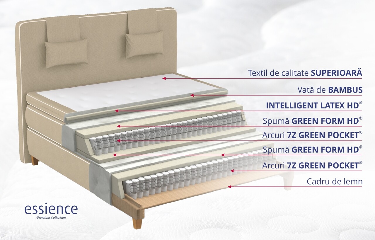Baza, conceputa din doua somiere pentru a usura montajul si curatenia, este facuta din lemn masiv, uscat in mediu controlat pentru a crea un cadru stabil cu durabilitate ridicata. Arcurile impachetate individual 7Z Green Pocket® din interiorul somierei asigura o stabilitate crescuta si un confort ortopedic si anatomic excelent.