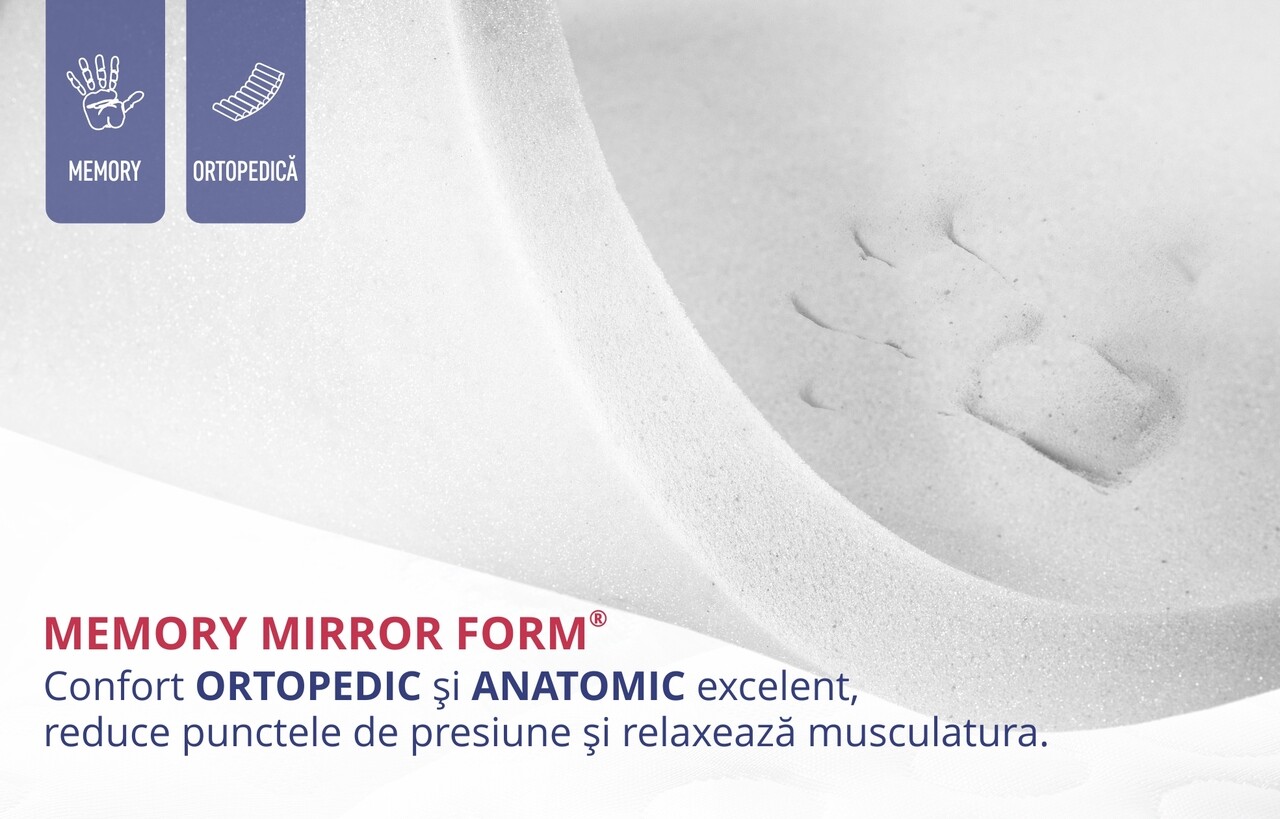 Stratul de confort este completat de topper care, gratie stratului de spuma Memory Mirror Form®, reactioneaza la caldura corpului si se muleaza pe acesta eliminand punctele de presiune pentru a relaxa muschii si a asigura o circulatie a sangelui corespunzatoare. In plus, stratul de spuma Memory Mirror Form® este prevazut cu gauri de aerisire asigurand o ventilatie excelenta in timpul somnului si contribuind astfel la mentinerea unui mediu uscat care impiedica formarea bacteriilor si a ciupercilor, principalii factori in dezvoltarea alergiilor.