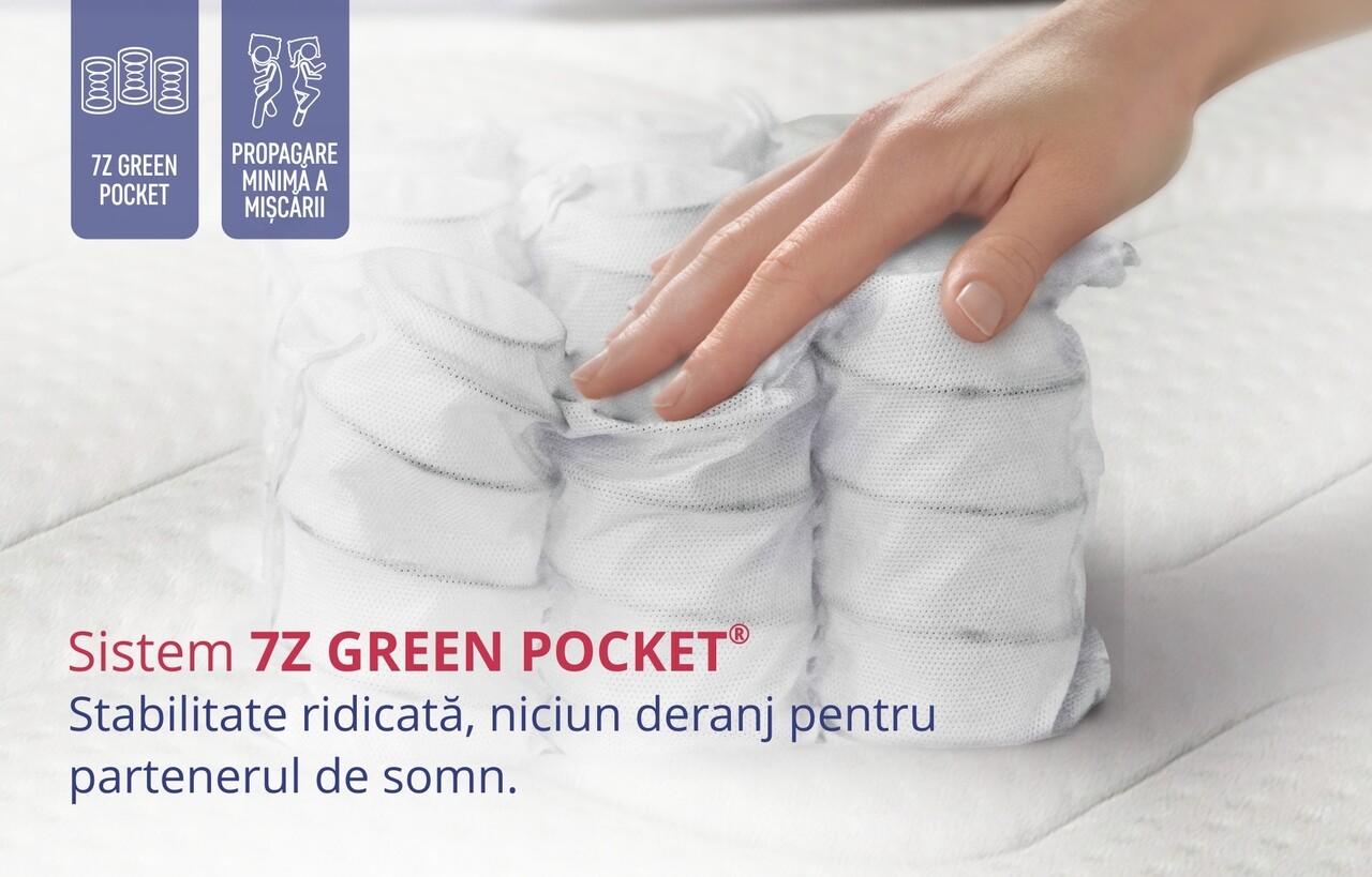 Salteaua vine in completarea bazei cu al doilea strat de arcuri 7Z Green Pocket® care, neavand legaturi intre ele, impiedica propagarea miscarii pe suprafata saltelei pentru a nu deranja partenerul in timpul somnului. In plus, 7Z Green Pocket® permite un suport diferit al partilor corpului in functie de presiunea exercitata de acestea pe suprafata saltelei pentru a asigura o aliniere corecta si sanatoasa a vertebrelor coloanei.