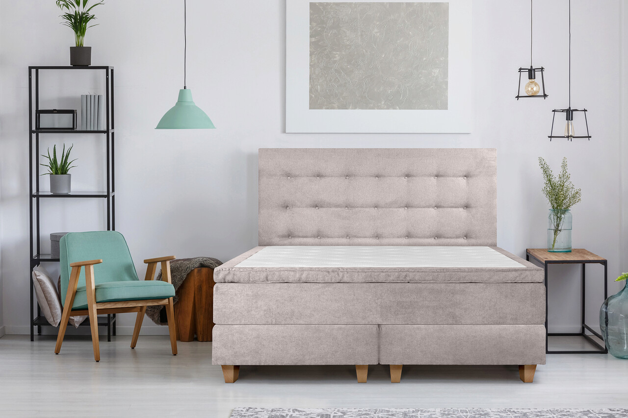 Pat matrimonial, Stockholm, Buttons E, 180x200 cm, saltea tip Pocket, topper memory, Taupe