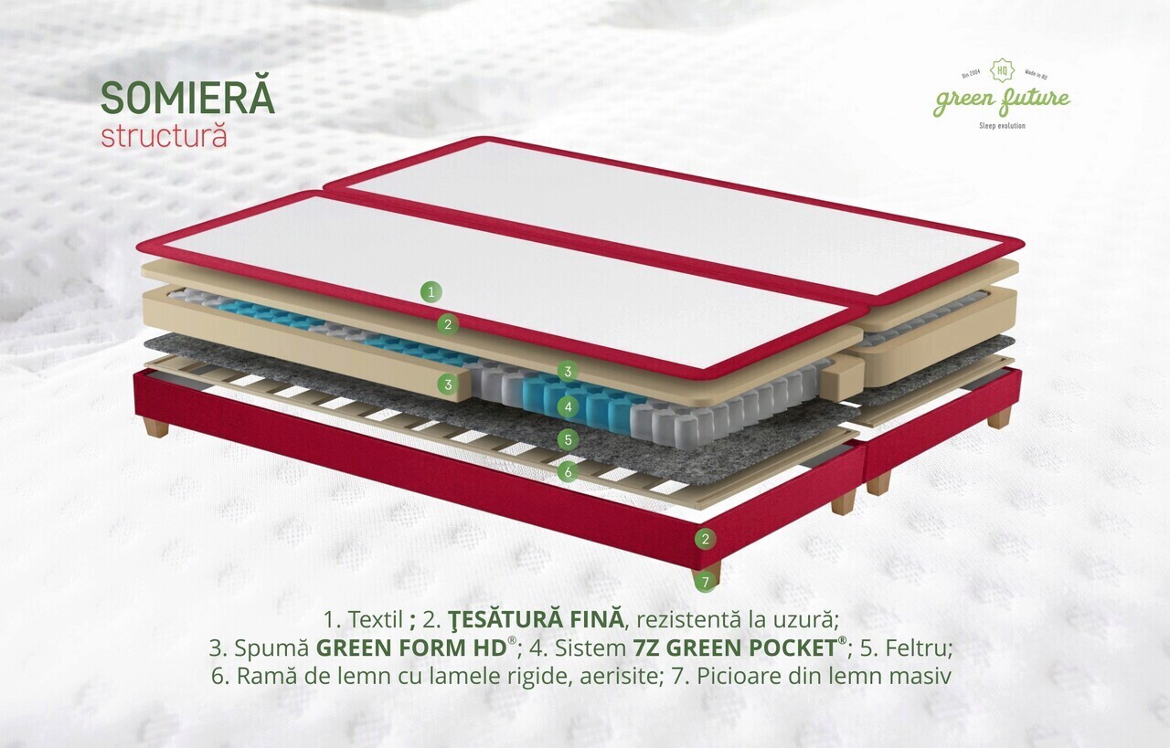 - Baza patului, realizata din lemn de inaltă calitate, serveste drept temelie robusta, creand un cadru stabil și durabil. Prevazuta cu tehnologia avansată a arcurilor 7Z Green Pocket®, aceasta este proiectata meticulos pentru a oferi o stabilitate sporita. Fiecare detaliu este optimizat pentru aerisire si suport, asigurand o baza solida pentru restul componentelor. In plus, structura patului este realizata din doua somiere separate, facilitand atat asamblarea rapida, cat si intretinerea usoara.