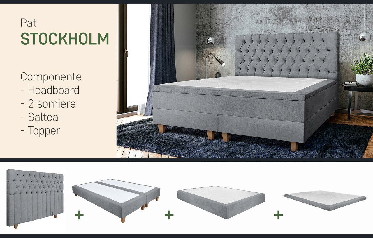 Pat matrimonial, Stockholm, Chester E, 180x200 cm, saltea tip Pocket, topper memory, Gri